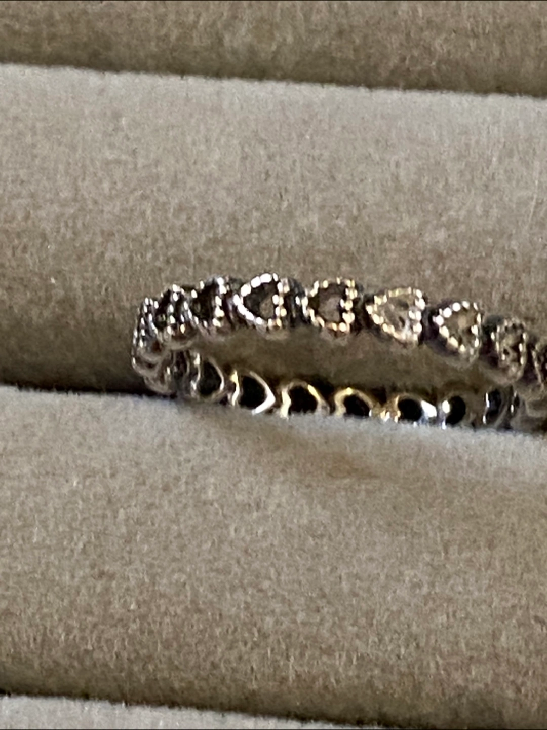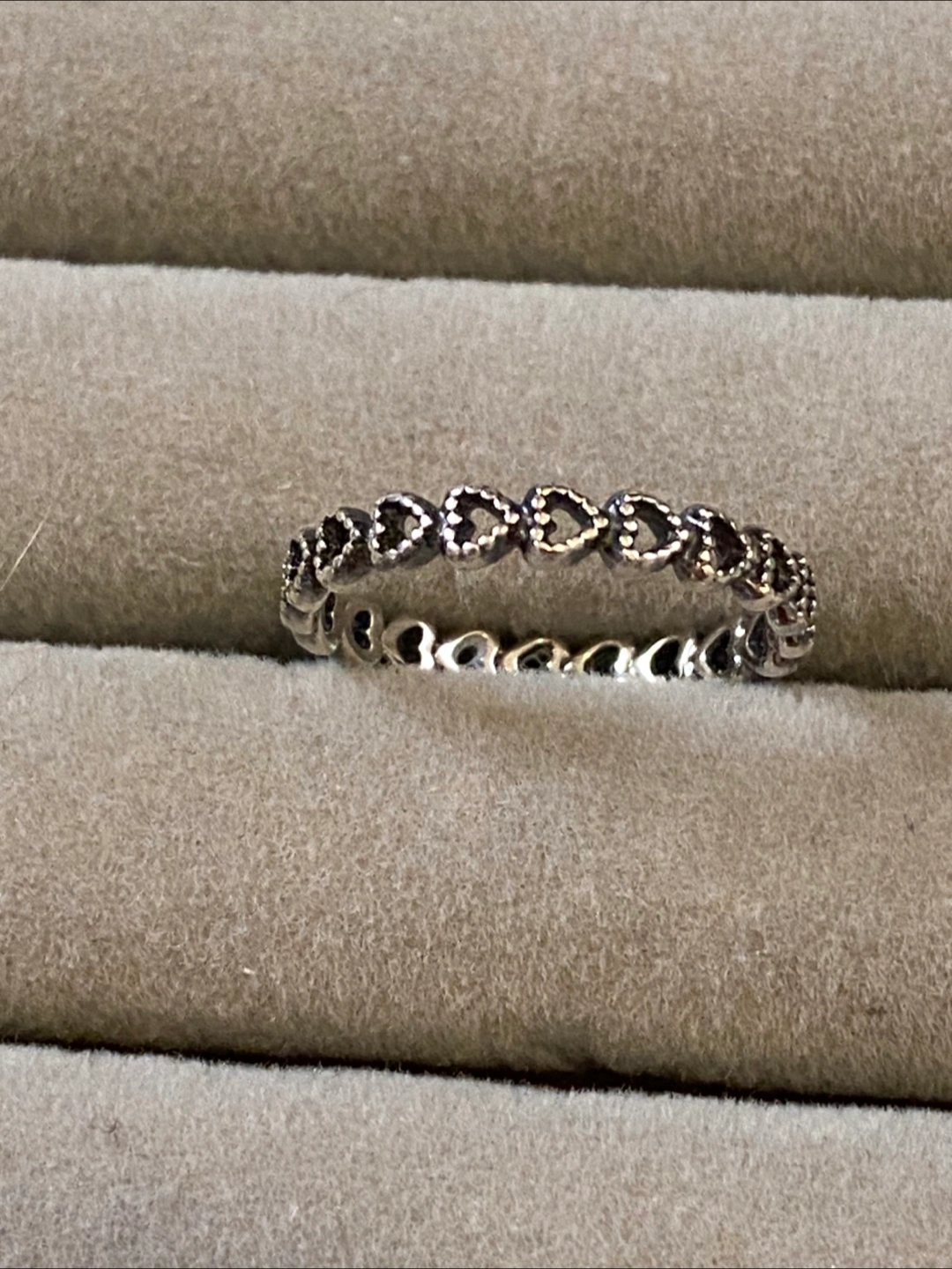 Selling a Pandora heart ring. It's stamped with P2 ALE 925, (54)sterling silver. The ring features an open heart design around the band and wear alone or stackable. Excellent used condition, just need cleaning.
