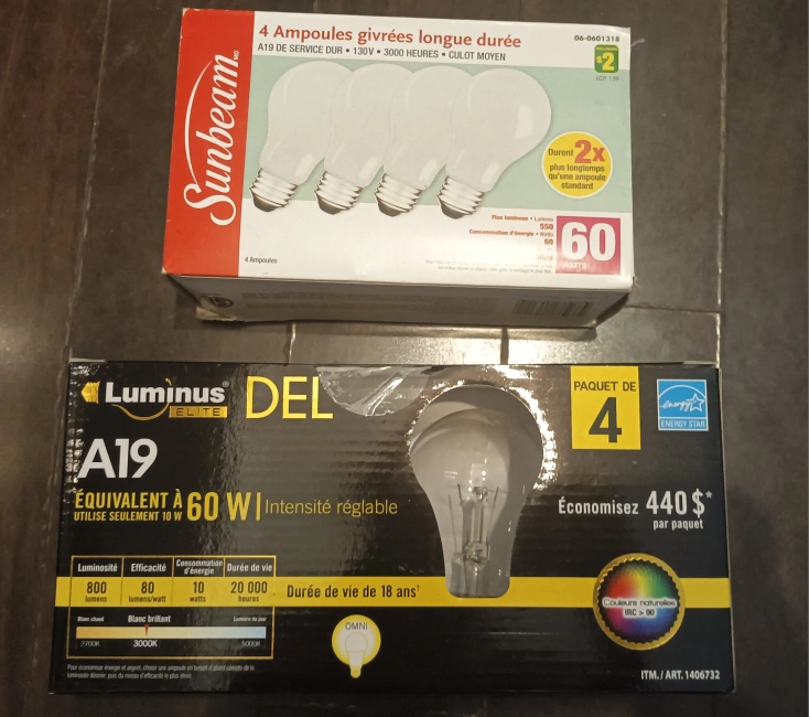 Selling a pack of Sunbeam and Luminus A19 light bulbs. - Sunbeam: 4 frosted bulbs, long-lasting, 130V, 3000 hours - Luminus Elite DEL: A19, equivalent to 60W, uses only 10W, dimmable, 800 lumens, 20,000 hours, natural colours