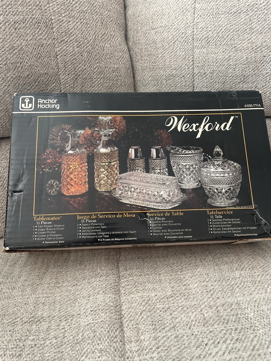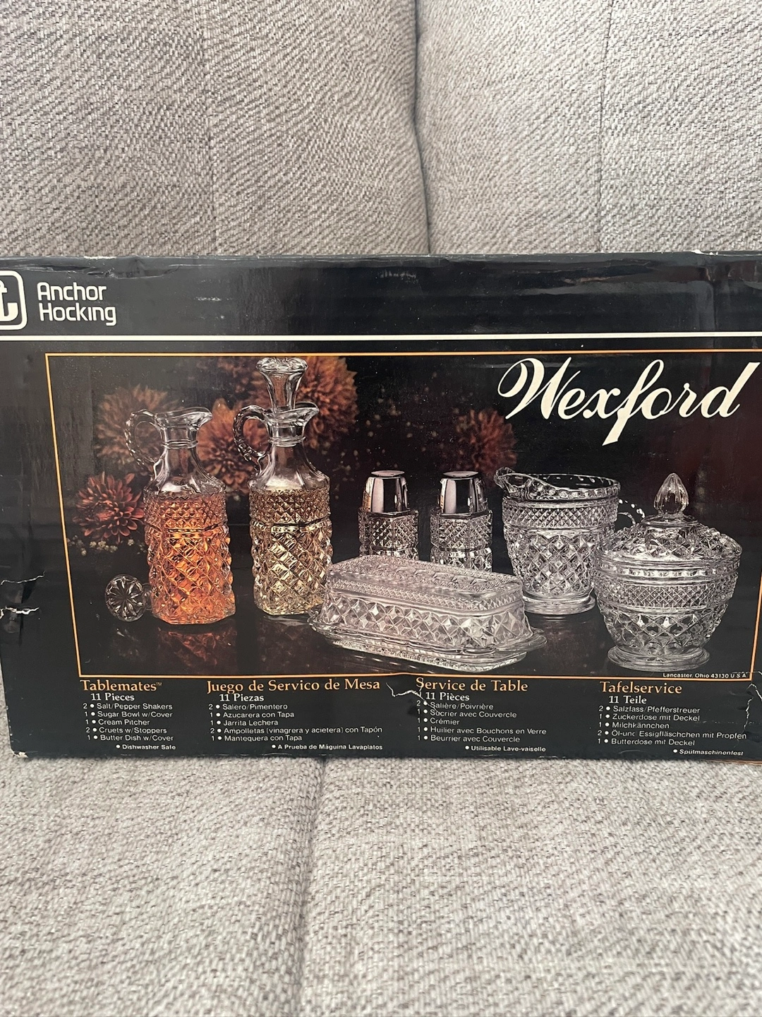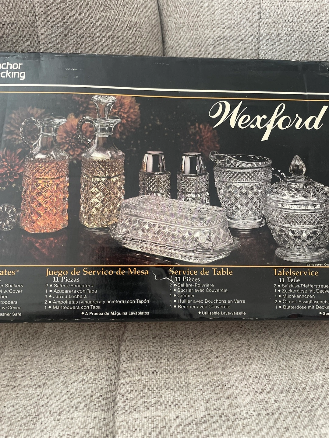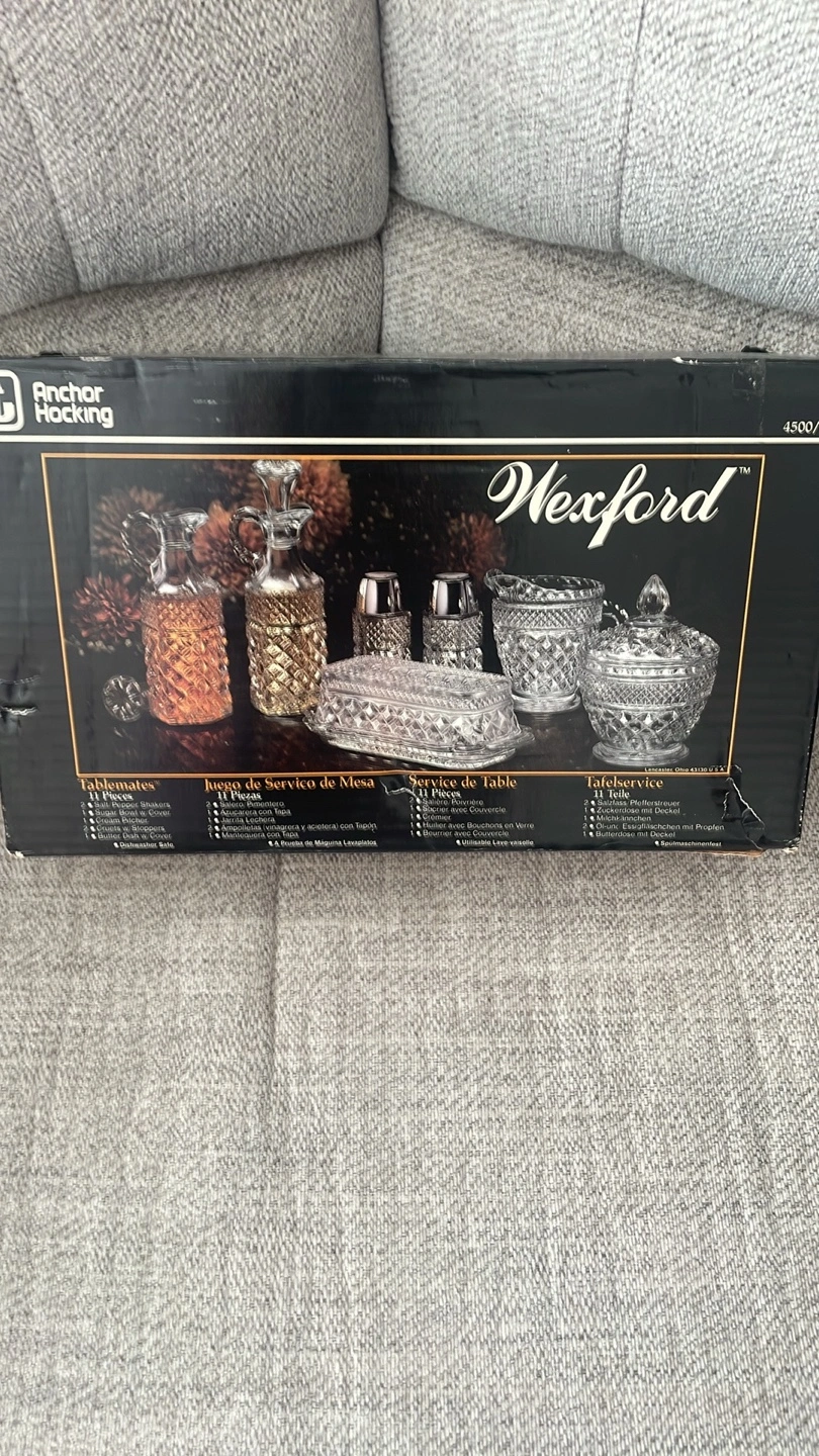 Selling an Anchor Hocking Wexford 11-piece table set! It's a beautiful set that includes: - 2 Salt/Pepper Shakers - Sugar Bowl w/ Cover - Cream Pitcher - 2 Cruets w/ Stoppers - Butter Dish w/ Cover It's also dishwasher safe for easy cleaning