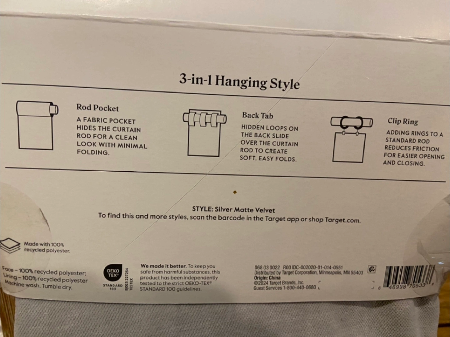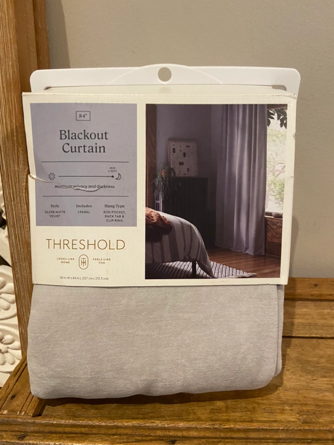 New Blackout Velvet Window Curtain Panel - Threshold 84”Lx50”W Silver Matte (light grey) 3 in 1 Hanging Style $25 (retail $55 plus tax) Pickup in Whitby