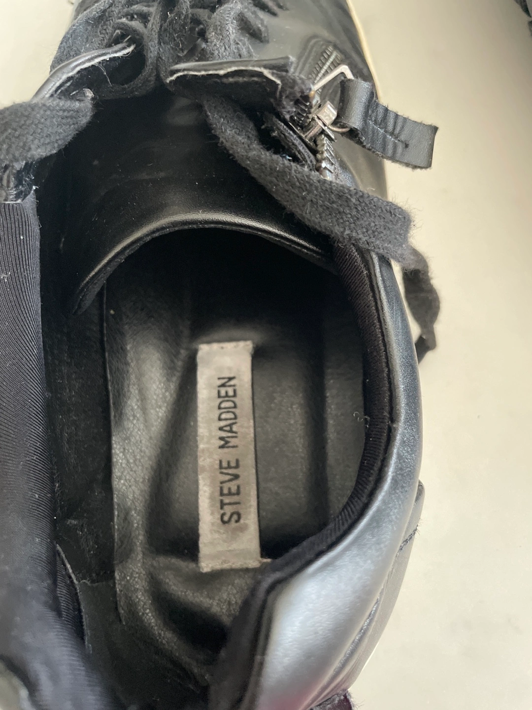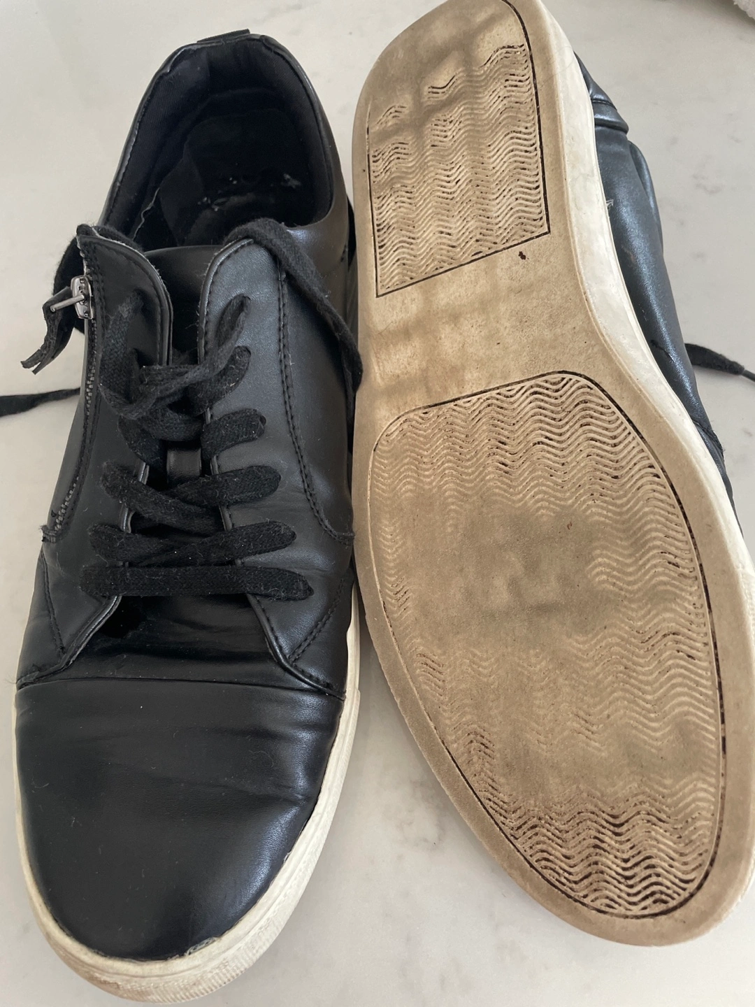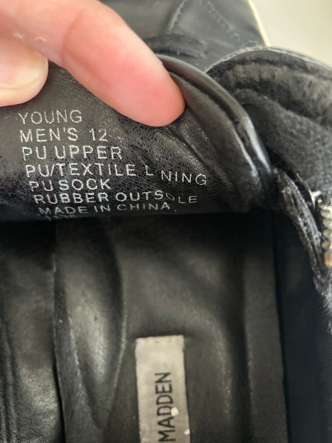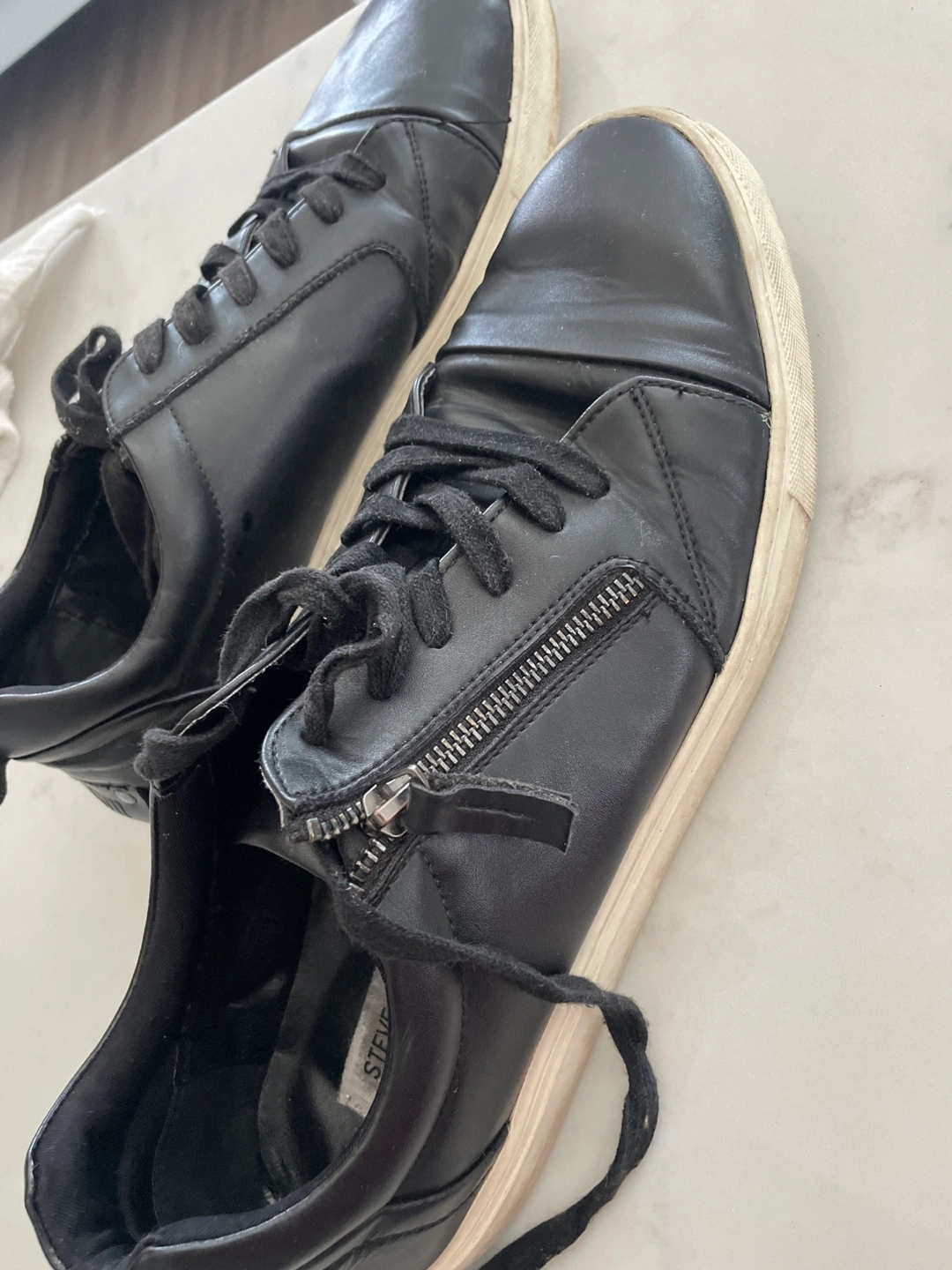 Selling a pair of Steve Madden YOUNG sneakers in men's size 12! They are black with a zipper detail. The upper is made of PU/textile, with a PU sock and rubber outsole. They show some signs of wear, but still have lots of life left!