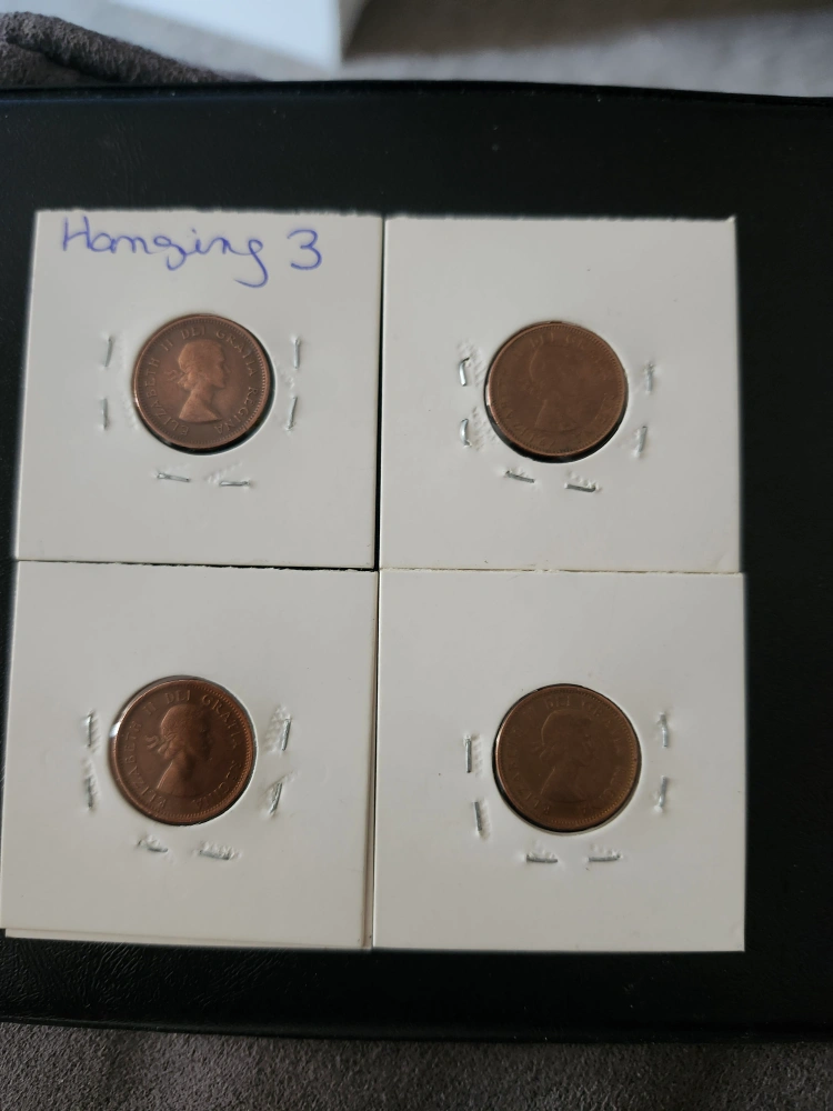 I'm selling a collection of vintage Canadian pennies! The collection includes pennies from 1953, 1954, 1955, and 1958. They're in great condition for their age and would be a wonderful addition to any coin collection they all have a hanging date