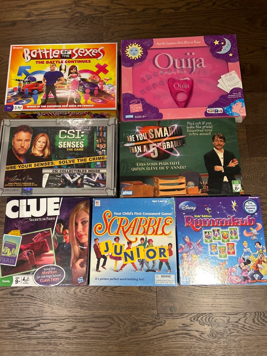Selling a collection of board games! $5 each or all 5 games for $20 Includes Battle of the Sexes, CSI Senses, Clue Secrets in Paris, and Disney Kids' Edition Rummikub. All games are in good condition and ready for a new home for family game nights! Ouija is SOLD Scrabble Junior is SOLD
