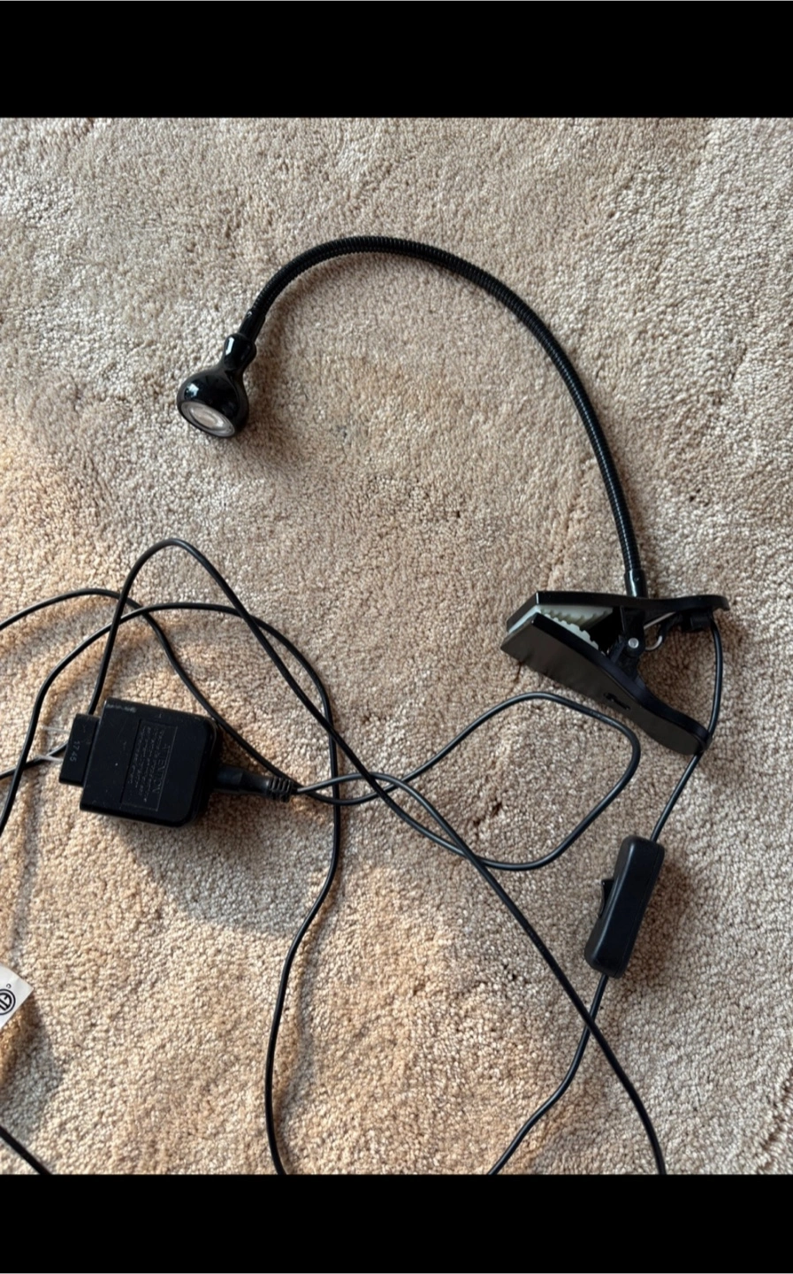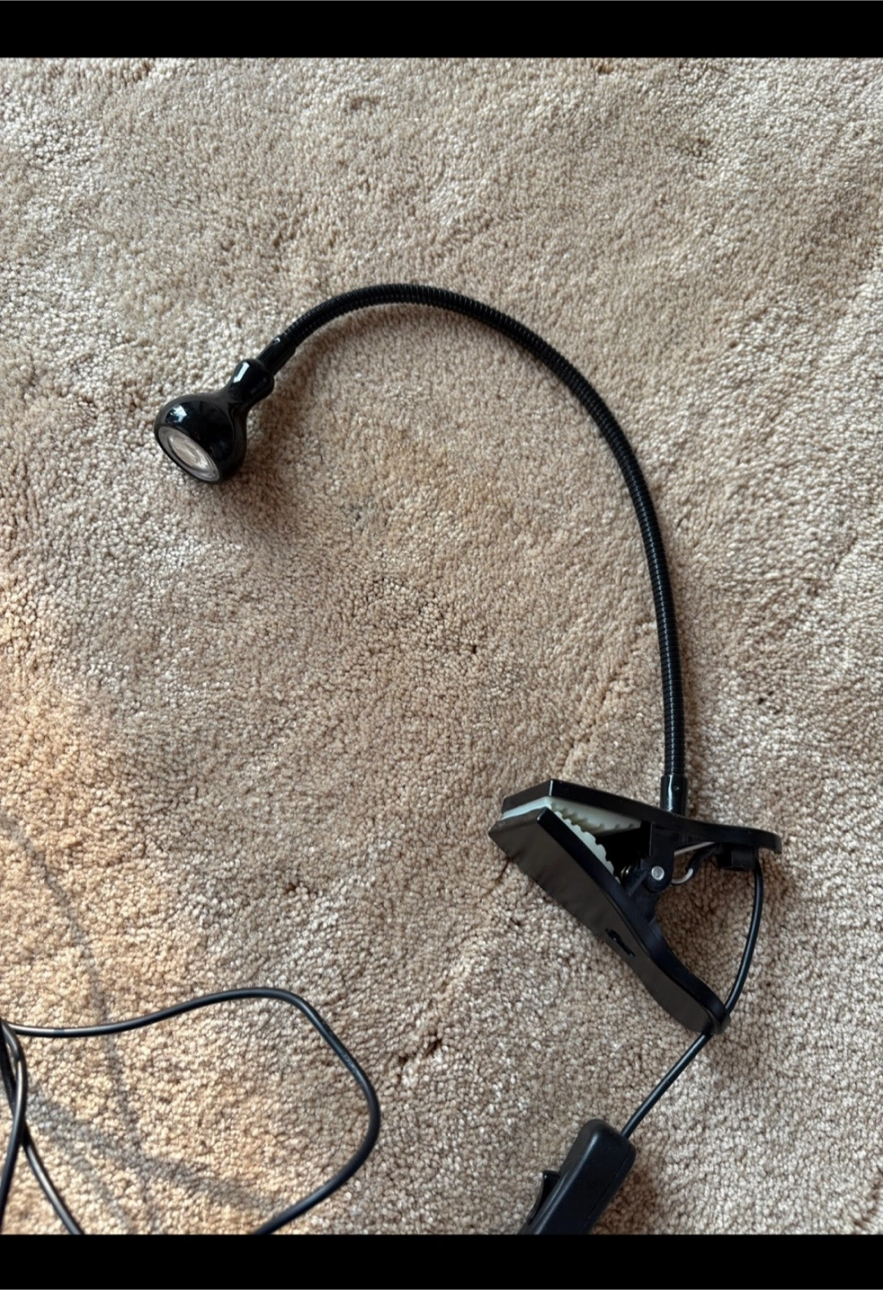 This is a handy clip-on desk lamp in black. It's perfect for a bedside table or desk where you need a little extra light. The clip is sturdy and easy to attach to various surfaces. It's in great condition and ready to use