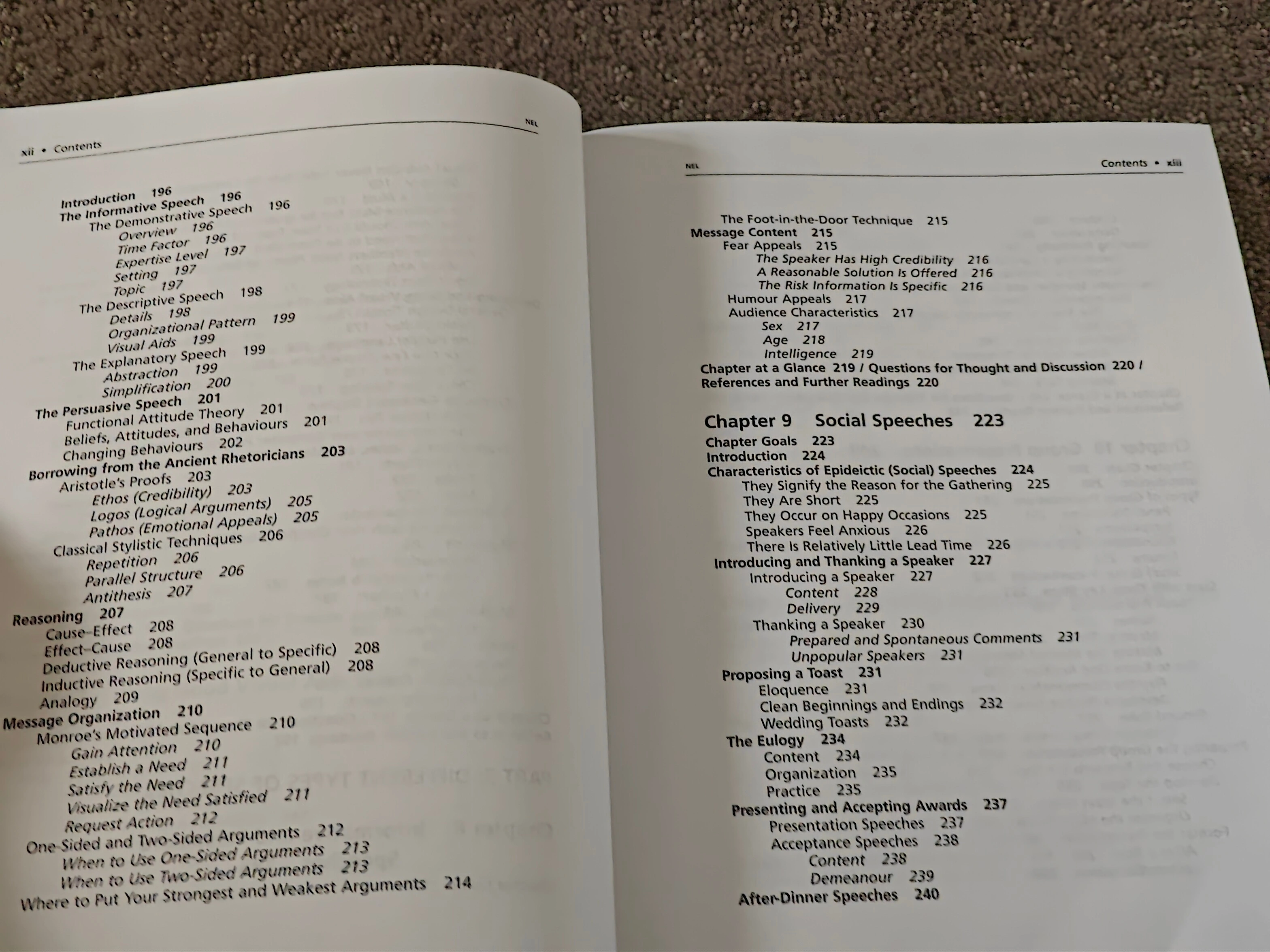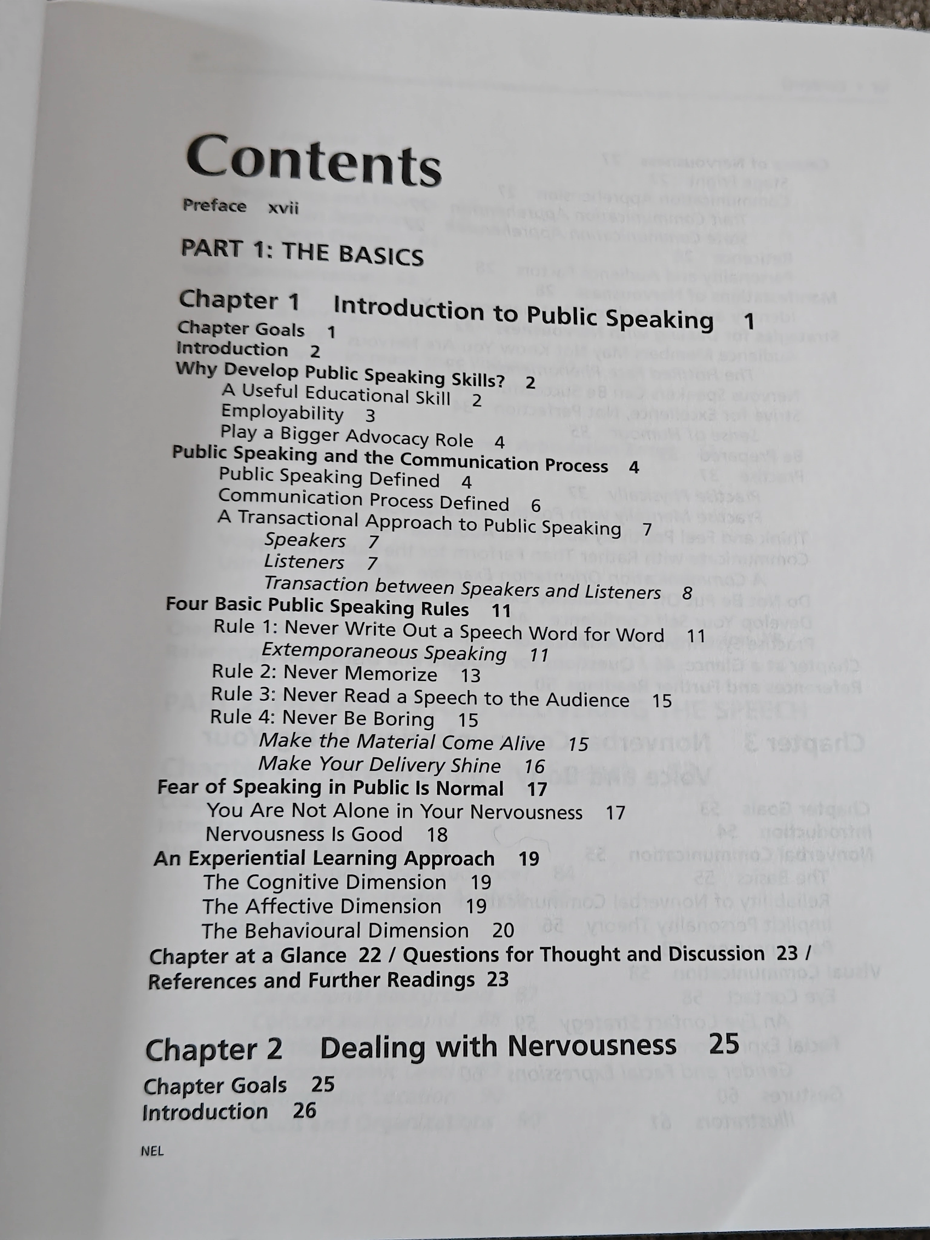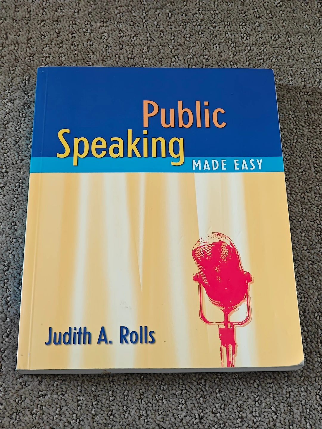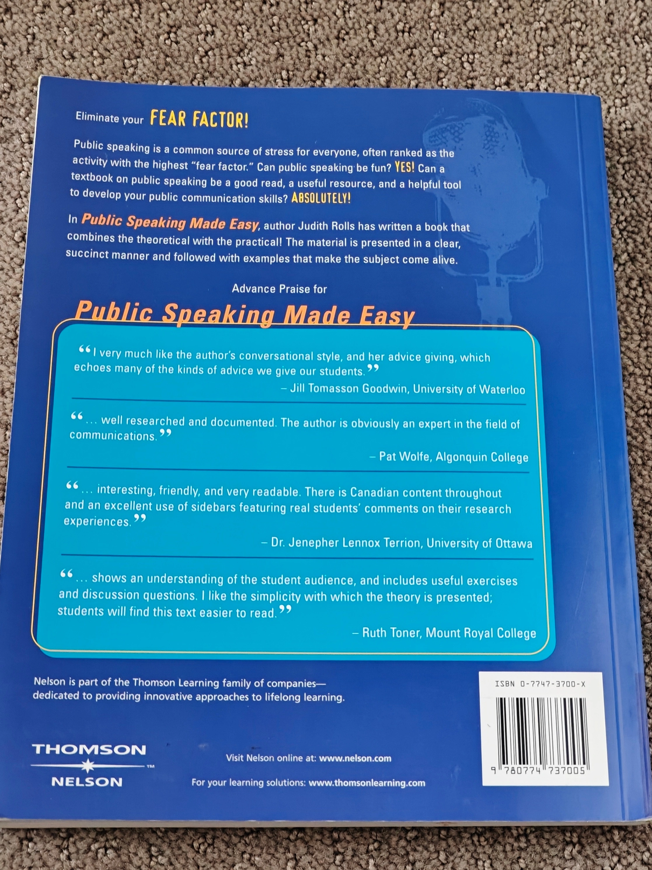 I am selling Public Speaking Made Easy Textbook in used, great condition. Author: Judith A. Rolls Pages: 320 Contents: * Chapter 1: Introduction to Public Speaking * Chapter 2: Dealing with Nervousness * Chapter 3: Nonverbal Communication: Using Your Voice and Body * Chapter 4: Researching the Speech * Chapter 5: Organizing the Speech * Chapter 6: Delivering the Speech in a Credible Manner * Chapter 7: Using Good Visual Aids Well * Chapter 8: Informative and Persuasive * Chapter 9: Special Speeches * Chapter 10: Group Presentations * Chapter 11: Conducting Employment Interviews Comes from a pet and smoke-free environment. Pickup in Mount Pleasant (NW Calgary)