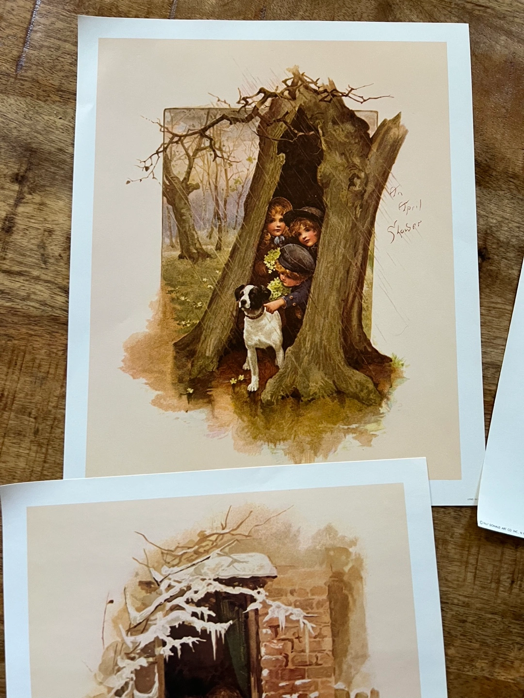 Vintage style art prints Set of 4 Measurements (including the boarders) The biggest is 10” x 14” (strawberry print) 9” x 10” (oil lamp) 9” x 11” (2 prints with children) Ready for frames and display Like new condition Asking $5 for all 4/Sold as a set Interested? Message me and please check my other listings…