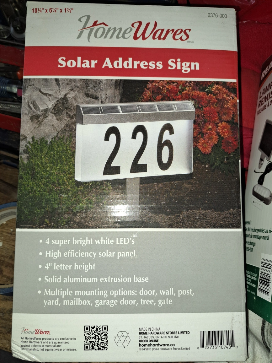 I have a brand new Home Wares Solar Address Sign for sale! It comes in its original box and features: - 4 super bright white LEDs - High-efficiency solar panel - 4" letter height - Solid aluminum extrusion base - Multiple mounting options for door, wall, post, yard, mailbox, garage door, tree, or gate Killarney area cash only