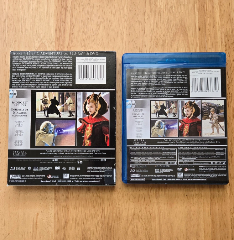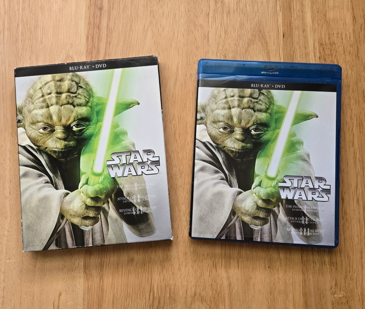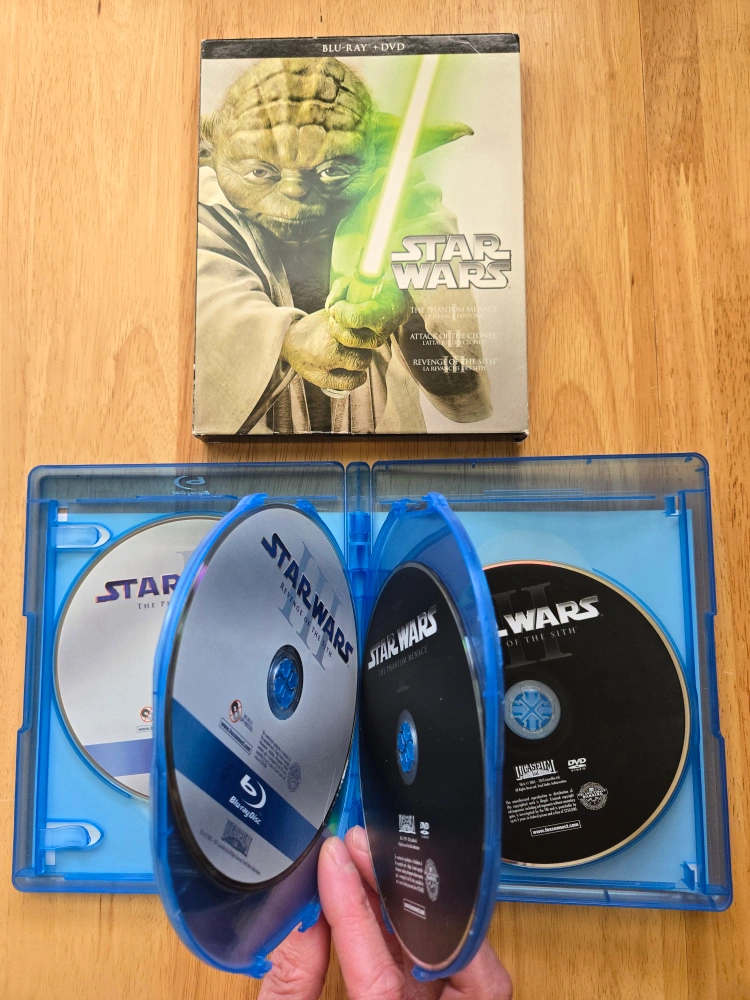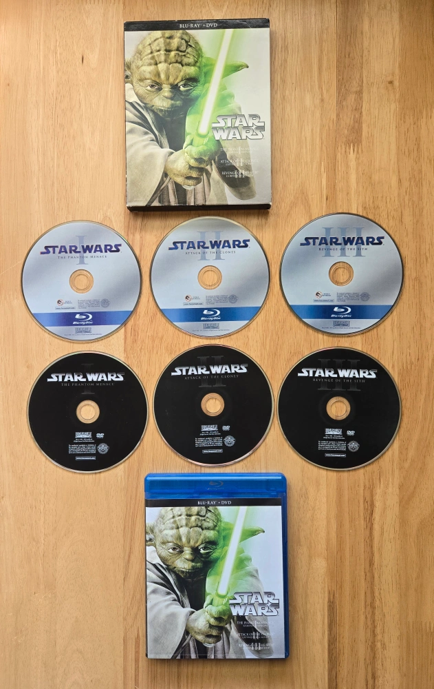 Star Wars Prequel Trilogy Episodes I-III Blu-ray Disc And DVD 6 Disc Set, Slip Cover EUC, Like New - No Scratches Format: Blu-ray and DVD Asking $10. No Holds Cash is preferable. Exact payment Only (No change) EMTs welcome. PICKUP Only, Weston area. Comes from a clean, bug free, smoke free, kitty friendly home. Willing to meet curbside. * Pls browse my other Blu-ray listings.
