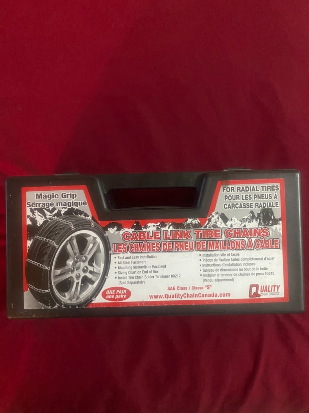 Selling a set of Quality Chain cable link tire chains! They offer fast and easy installation with all steel fasteners. Easy to mount on wheel.