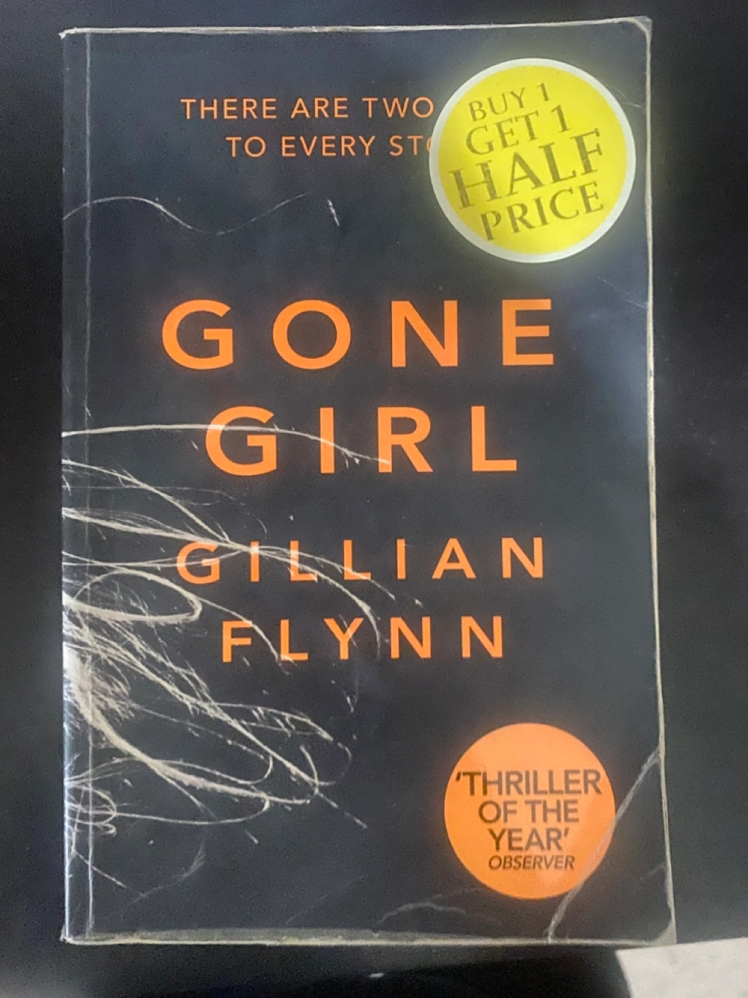 Selling a copy of Gone Girl by Gillian Flynn. It's a thriller novel, as noted by the 'Thriller of the Year' sticker! Perfect for anyone who enjoys a suspenseful read