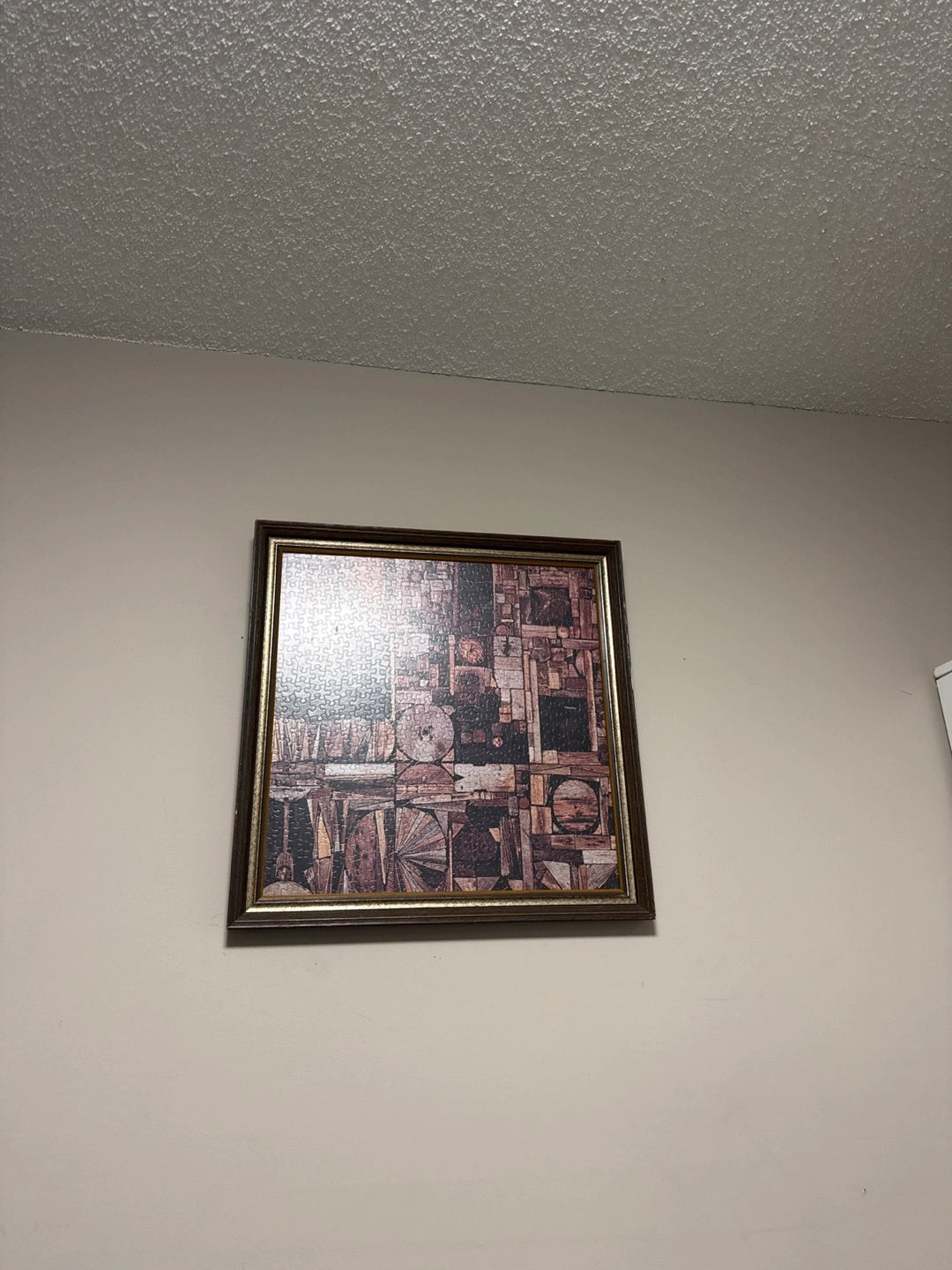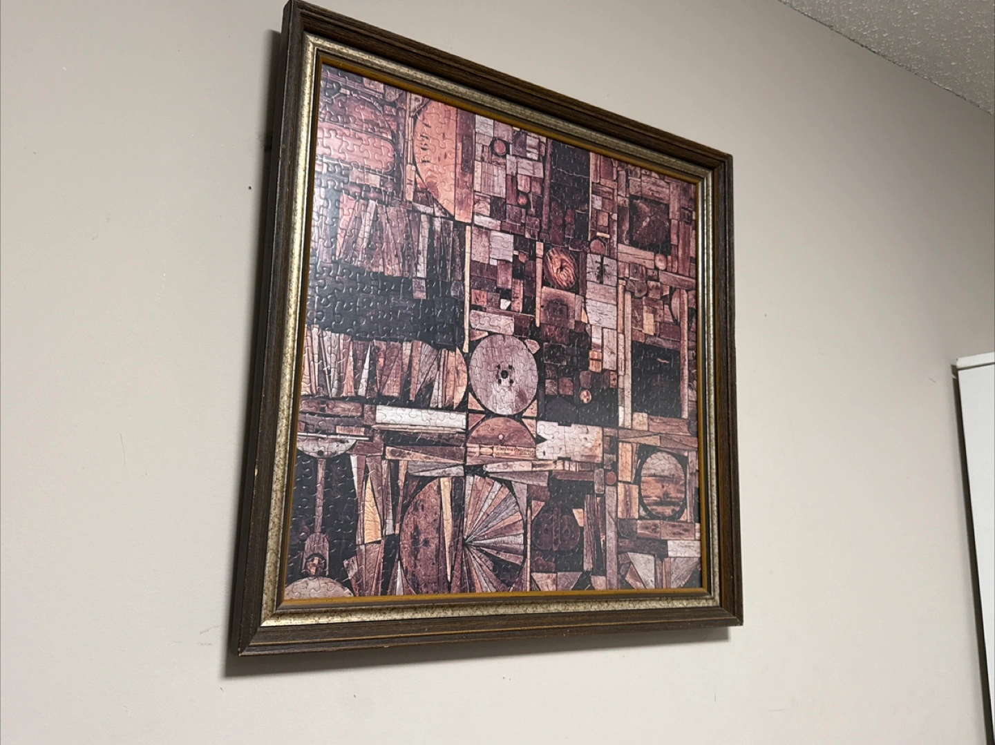 Selling a framed piece of wall art. It features a unique design with various geometric and abstract shapes in earthy tones. It would be a great addition to any home decor!