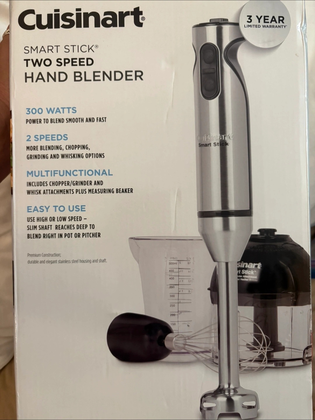 Selling a Cuisinart Smart Stick Two Speed Hand Blender. It's a 300-watt blender that blends smooth and fast! It has two speeds for more blending, chopping, grinding and whisking options. It's multifunctional and includes a chopper/grinder and whisk attachments plus a measuring beaker. The box and instruction/recipe booklet are included. New, never used. Bought for Mum and she never used it.