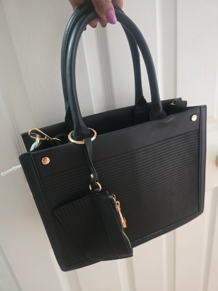 This is a stylish black Call It Spring tote bag that comes with a matching coin purse! It has a structured design and is perfect for everyday use. The bag features both handles and a shoulder strap for versatile carrying options