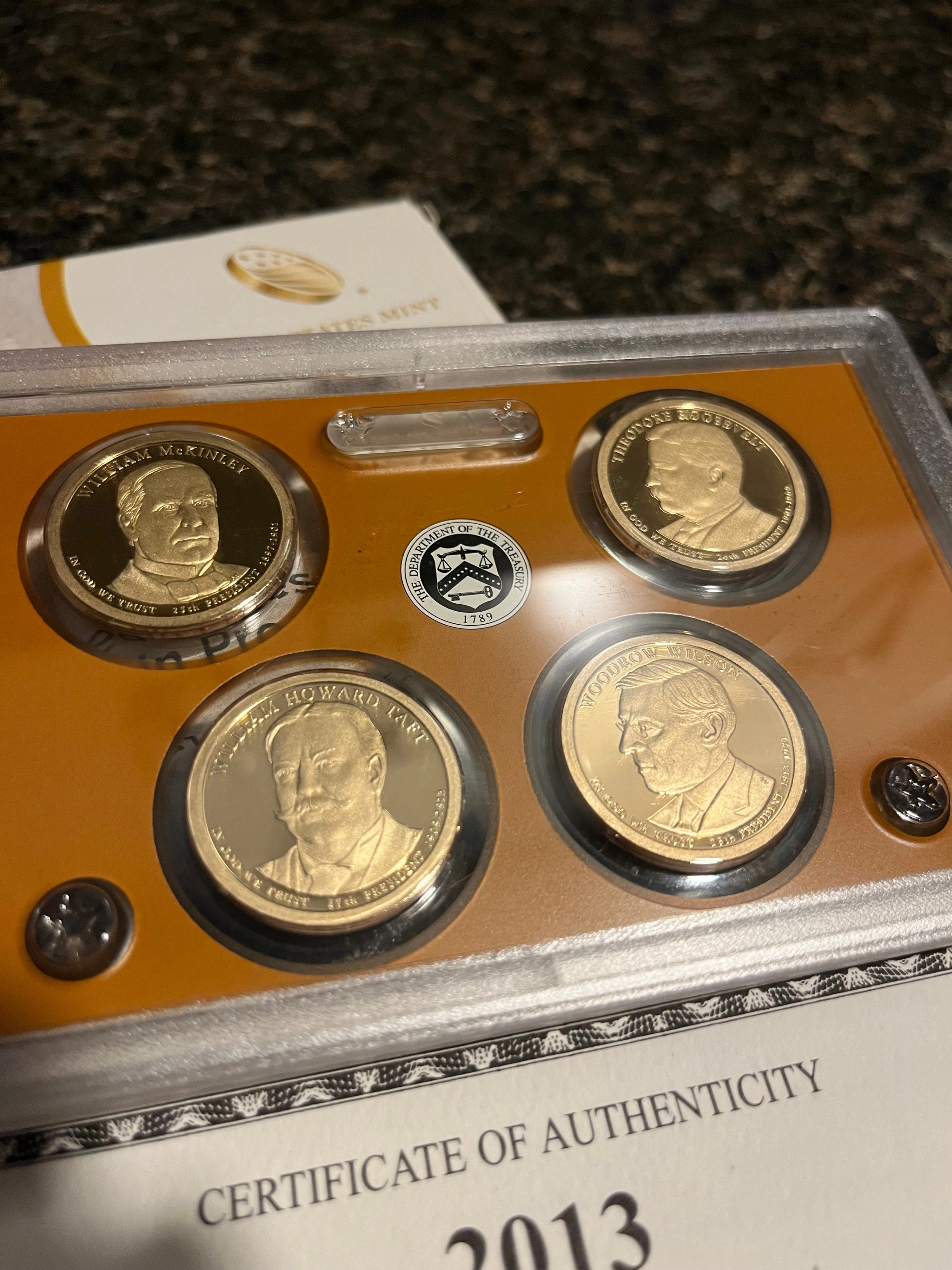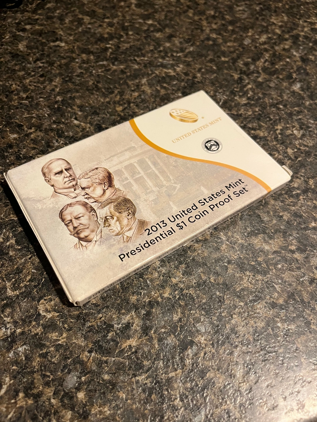 2013 US Mint Presidential Coin Proof Set Original Government Packaging in protected case. Sold online for $35 (US Dollars) roughly ($50 Canadian). Presidents McKinley, Theodore Roosevelt, William Taft and Woodrow Wilson. Reverse features Statue of Liberty. Perfect condition, Case never opened. Attached some links below with value and info. Asking $25. Please message or text 416-833-1623. Thanks :) https://www.amazon.com/Presidential-Proof-Original-Government-Packaging/dp/B00KLIWF0Y https://www.littletoncoin.com/shop/2013-s-us-mint-presidential-dollar-proof-set-ps2013pd-wc?srsltid=AfmBOoq_iHvwy2rNsDGQFZgWyO0PyMIn7stUXZf9ObVwpcCXGFl3dW-K