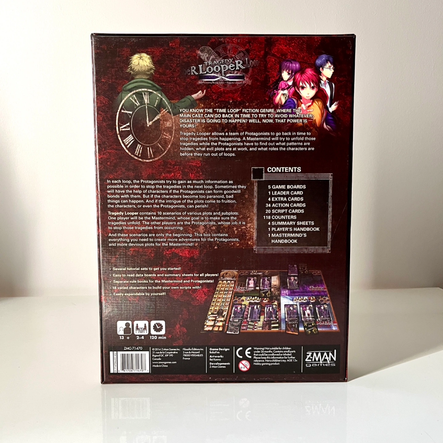 This is a time-looping deduction game for 3-4 players and offers 120 minutes of strategic gameplay. All pieces included- cards have been sleeved. In good condition.