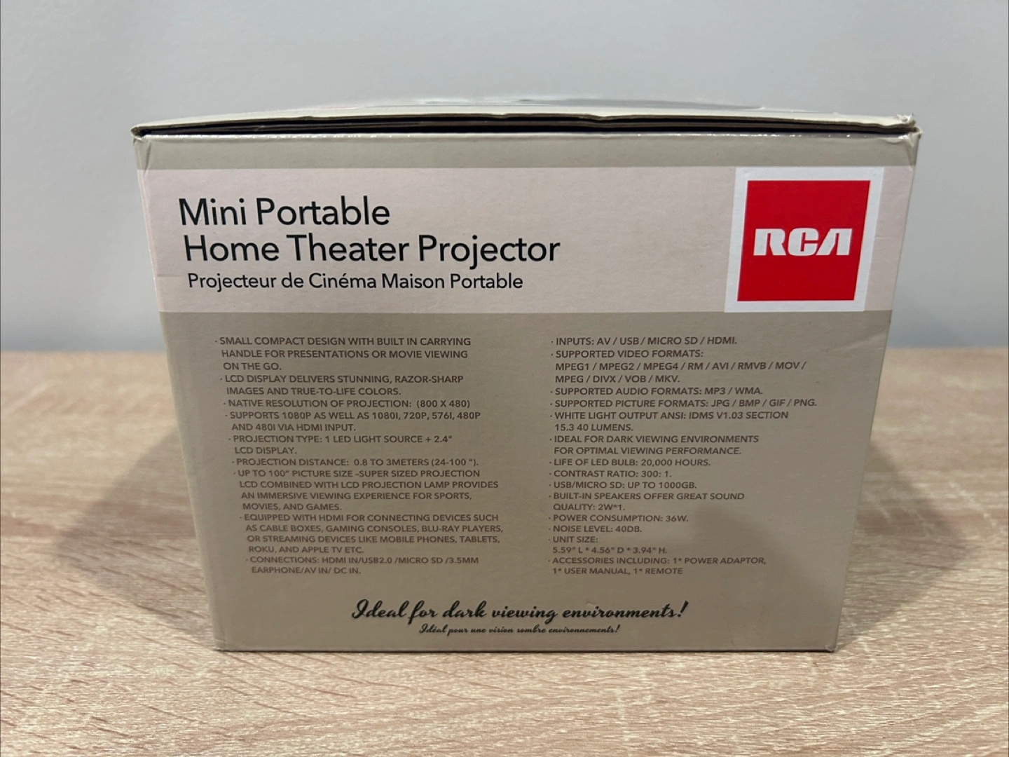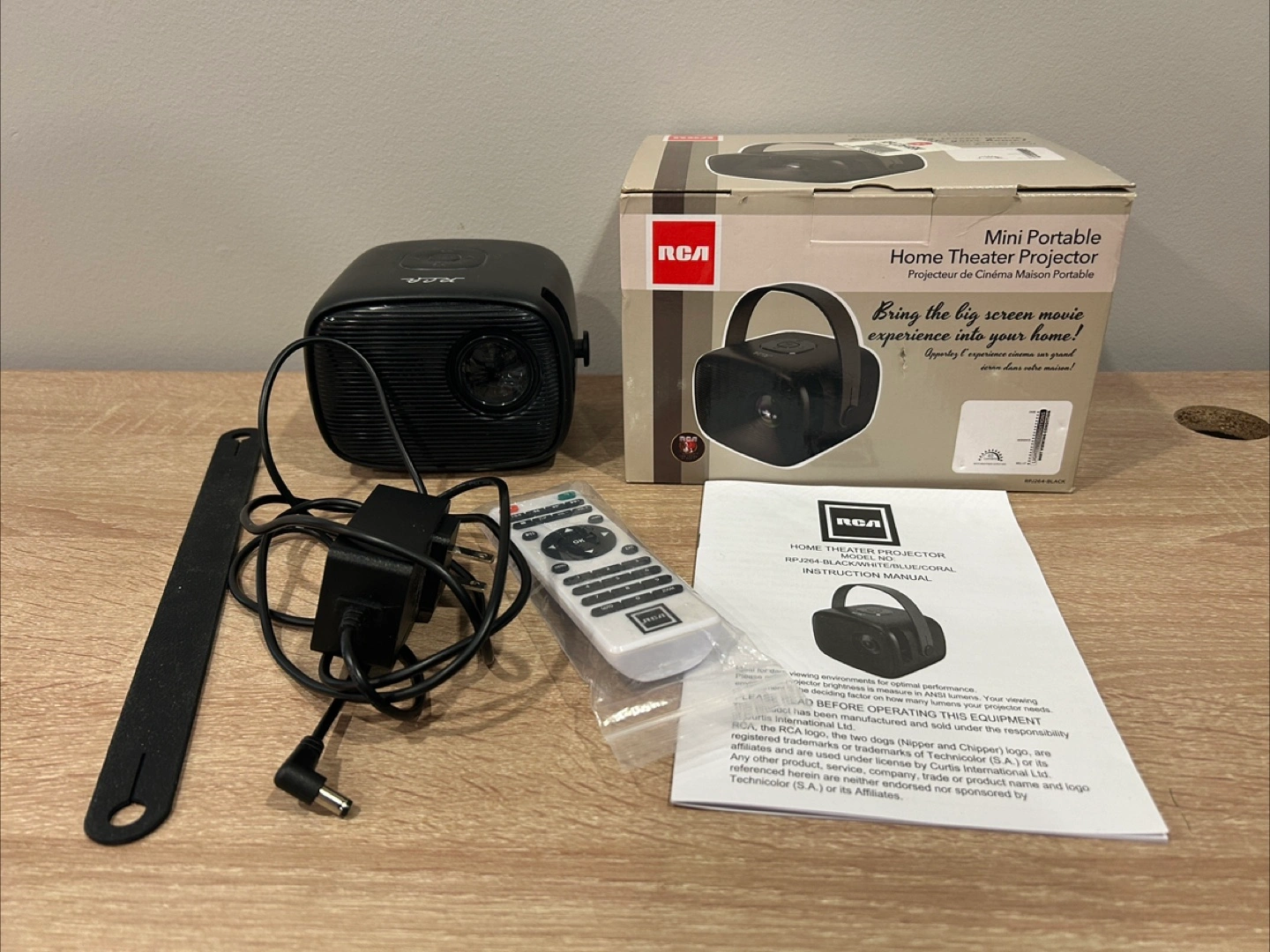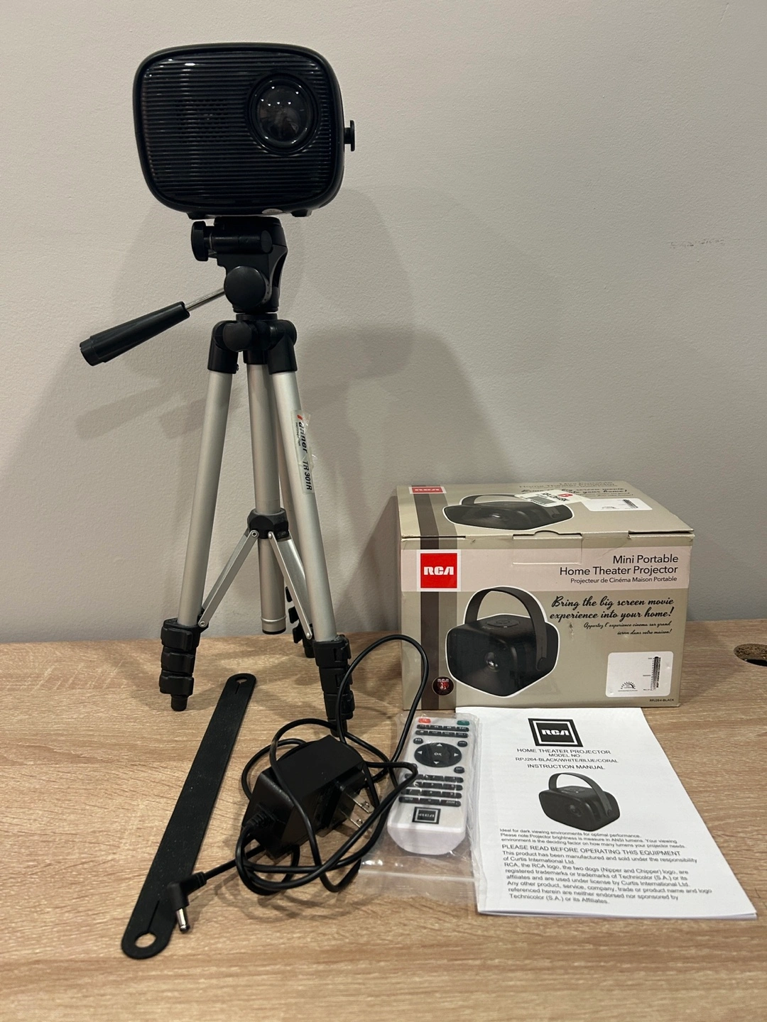 Bring the big screen movie experience into your home with this RCA mini portable home theatre projector! It's in great condition and comes with the original box with all the original components like the power cord, remote, carrying strap and user manual. Key features: - Compact design with built-in carrying handle - Supports 1080p - Native resolution of 800x400 - Built-in speakers - Takes HDMI, USB, Micro SD card, AV input $40 for the project with all original components, in ready to use state. Add-on components available if desired. The extendable tripod (+$15) allows the project to stand freely at an adjustable height. The Ghost Manta micro SD 128GB (+$15) is formatted to the correct format to be read by the projector, allowing you to store video, audio and more to be played without connecting another device. Can also add in a HDMI cable for $5 (not included in the original kit). The projector along with all the add-ons can be bundled for $70.