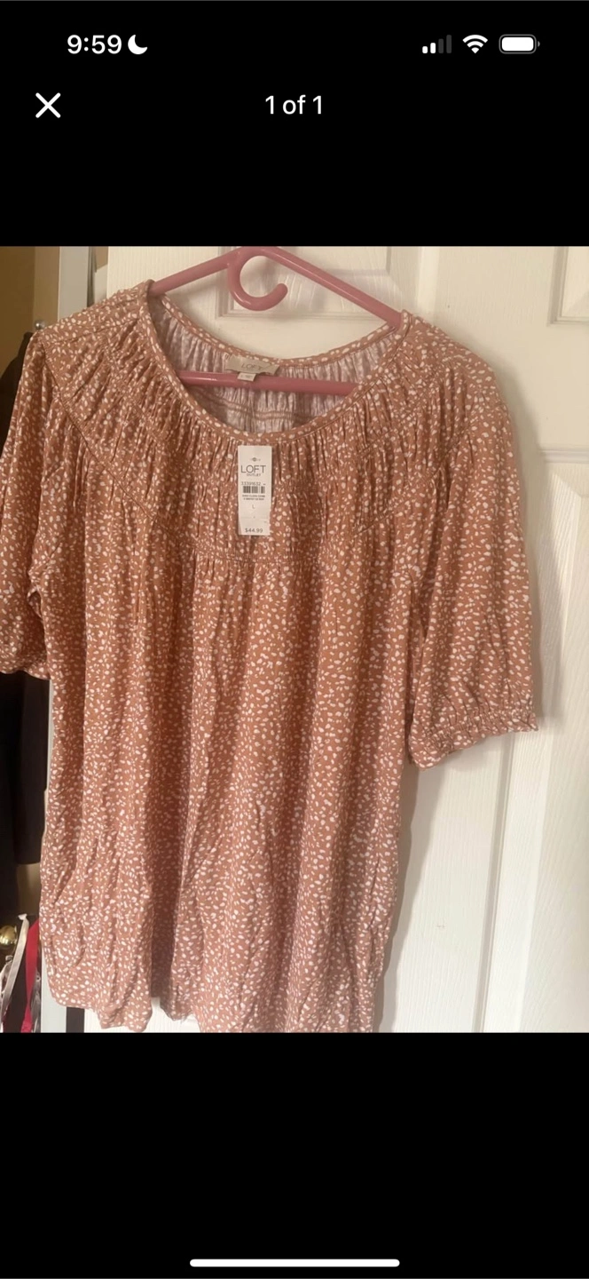 I'm selling a brand new LOFT blouse! It's a lovely brown colour with a delicate floral pattern. This blouse is a size L and still has the original tag attached, showing it was originally bought for $44.99