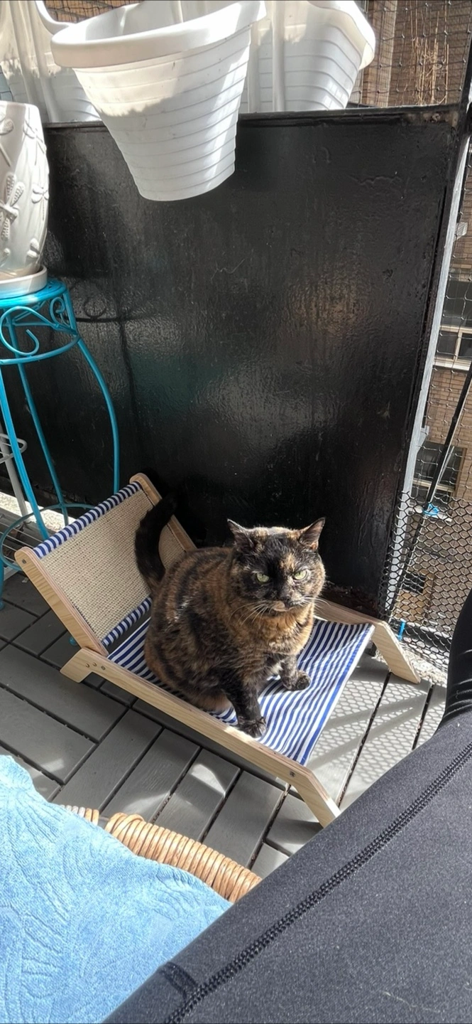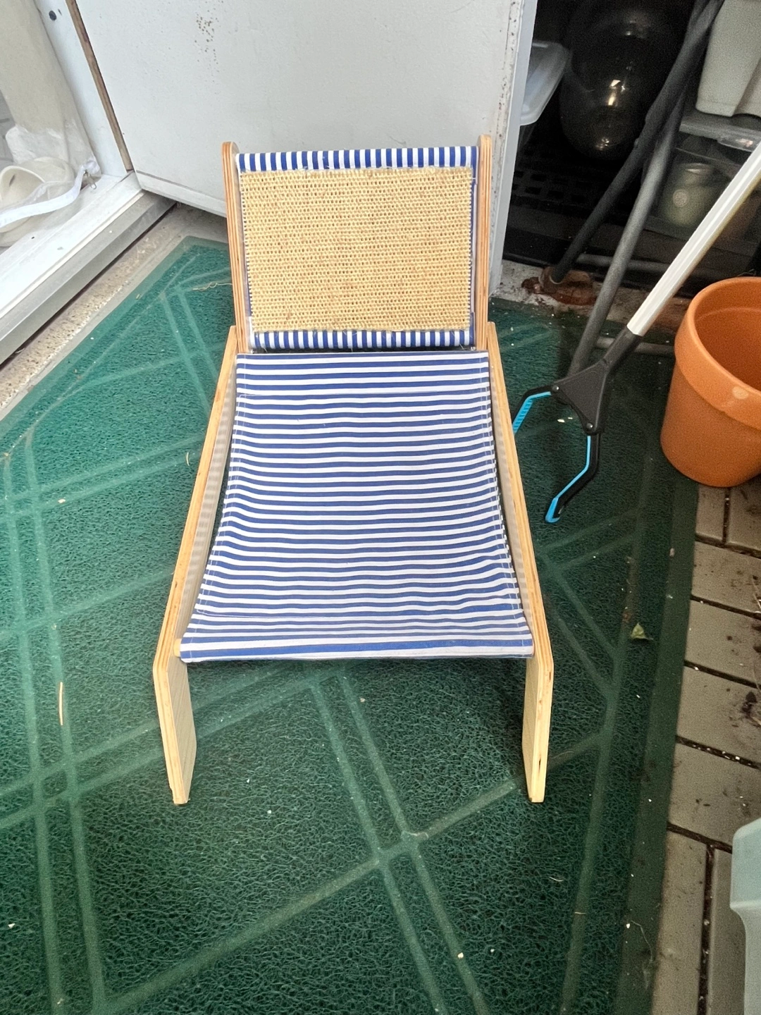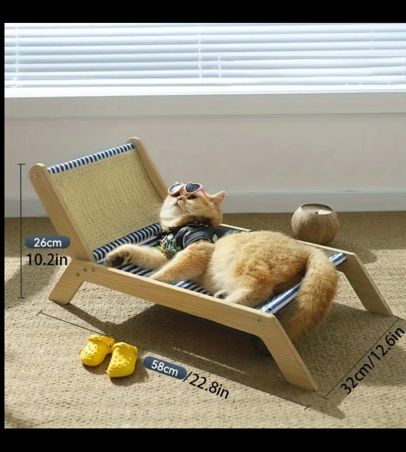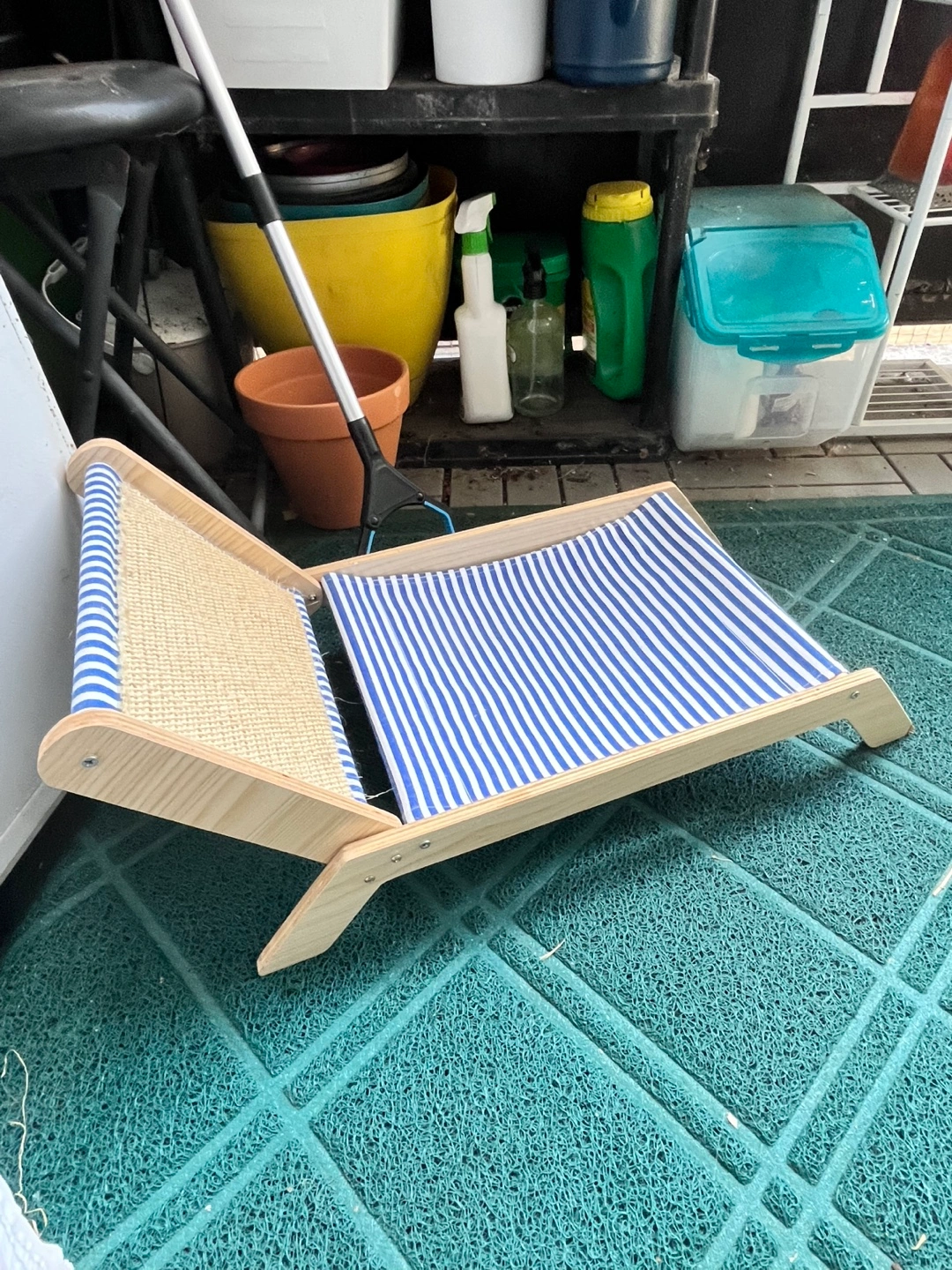 Selling a cute beach-style cat lounge chair. Good for cats or small dogs. See pictures for measurements. The chair features a striped blue and white fabric, a natural wood frame, and a sisal rope scratcher head rest (very lightly used). This was used for less than 3 months, mostly for lounging by my cat, the scratcher piece was barely used. LOCATION: for pickup in Parkdale near King St W and Jameson Ave