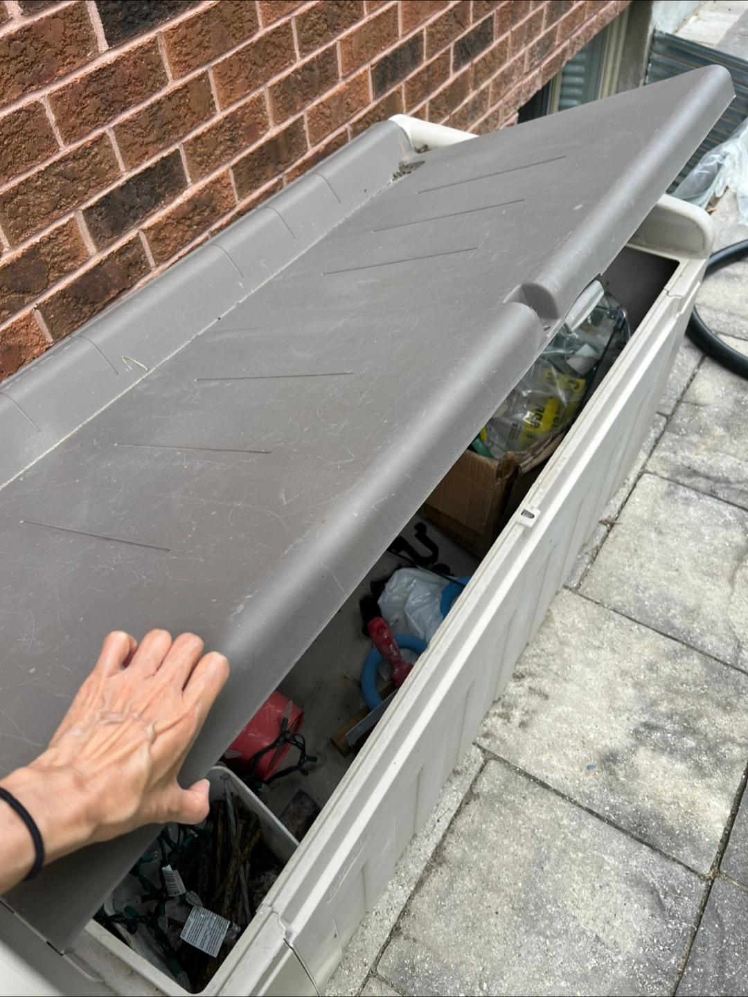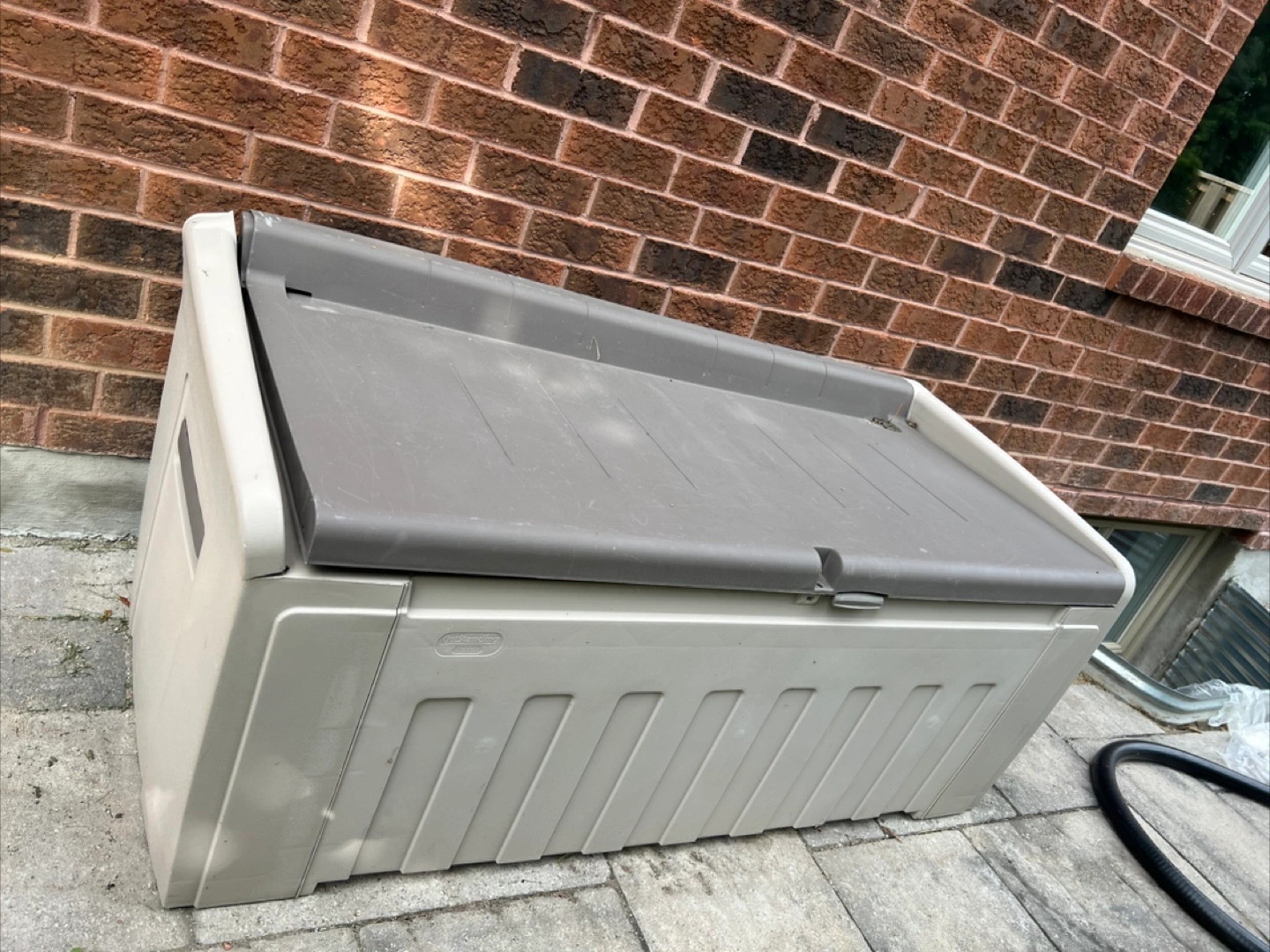 This Suncast extra-large deck box is perfect for storing outdoor items. It's in good condition and ready to use in your backyard or on your deck. The colour is a neutral beige and grey that blends well with any outdoor setting