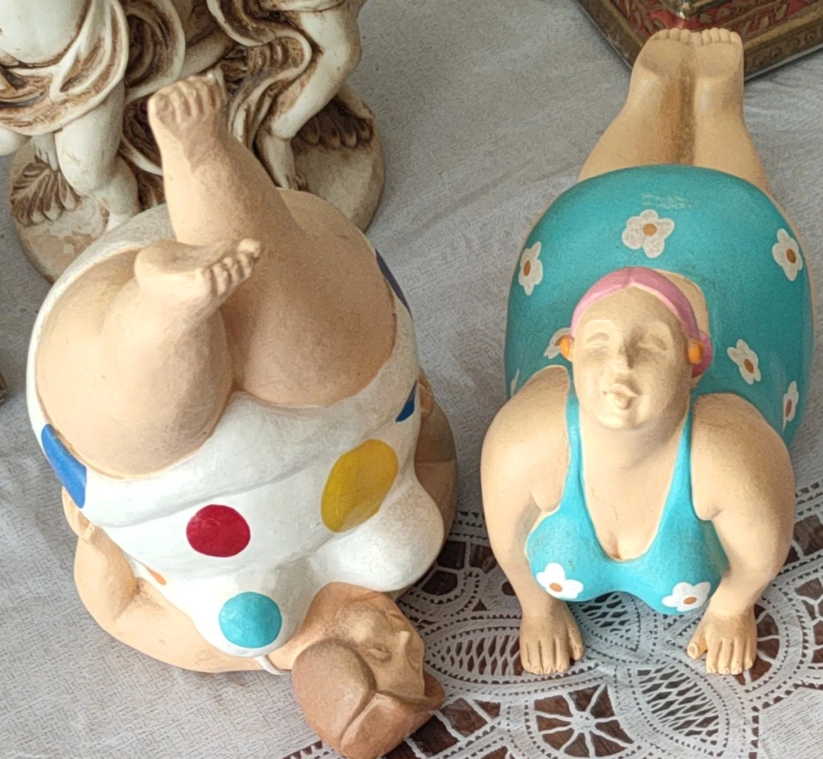 I have two unique vintage ceramic figurines of sunbathers. One is wearing a white swimsuit with colourful polka dots, and the other is in a light blue swimsuit with white flowers. They would make a fun addition to any collection or a quirky decor piece for your home