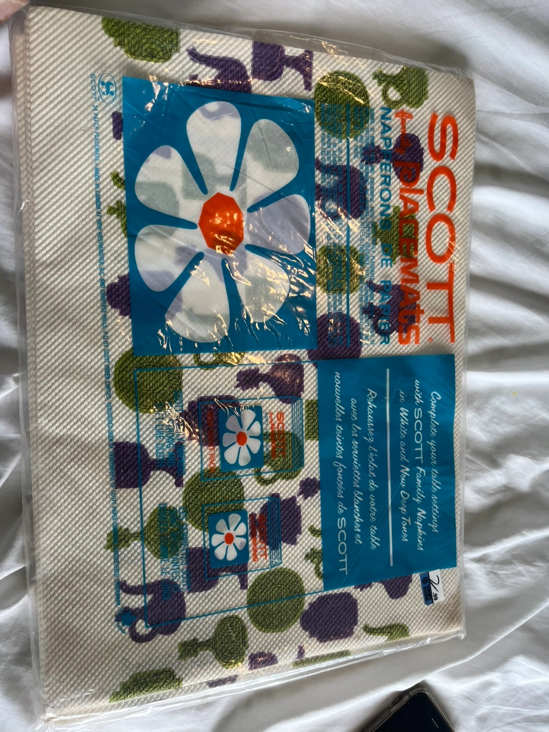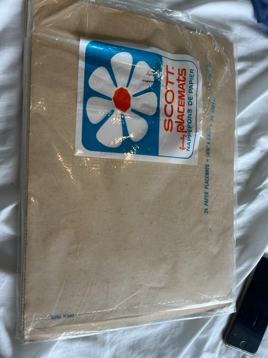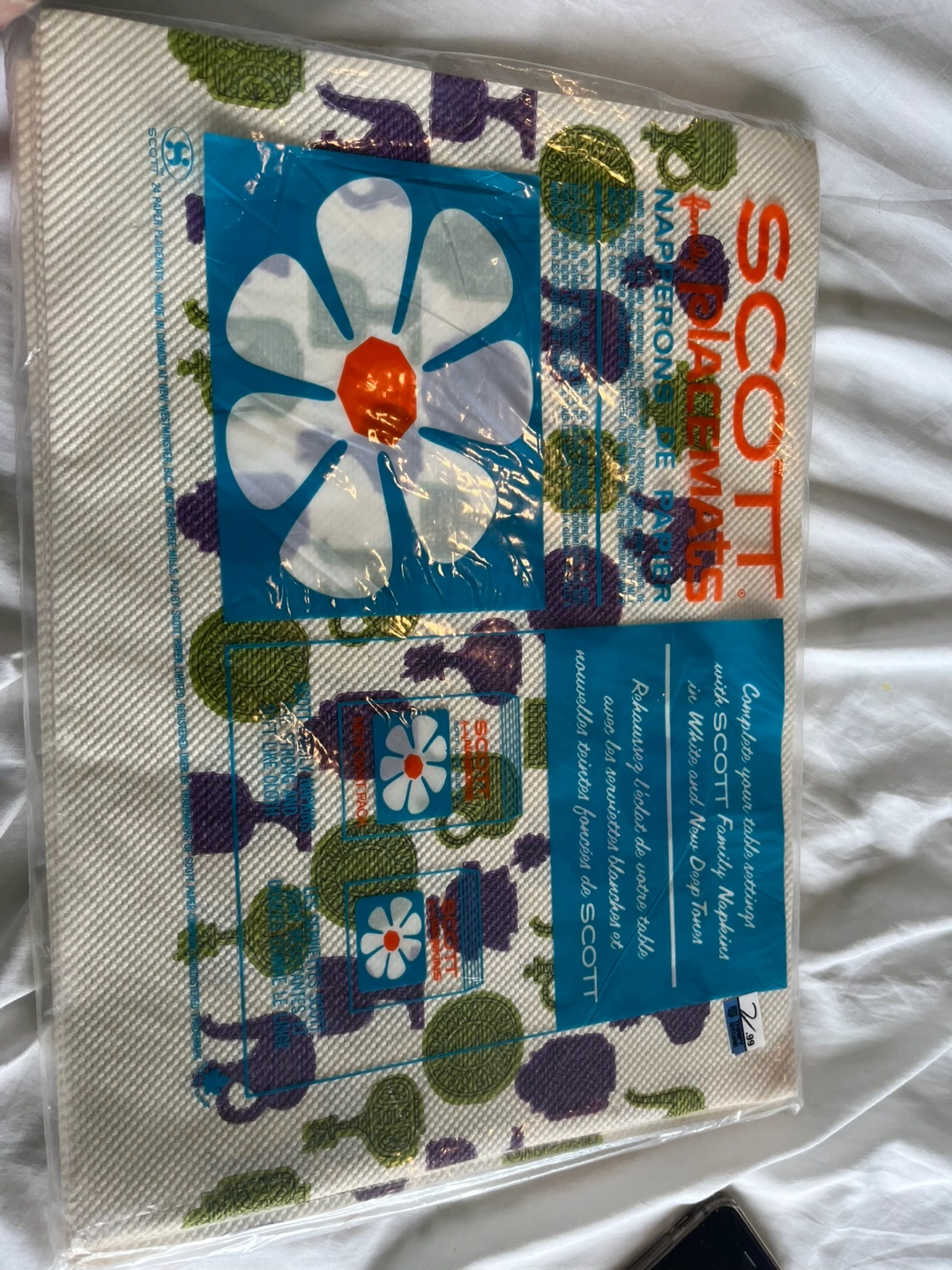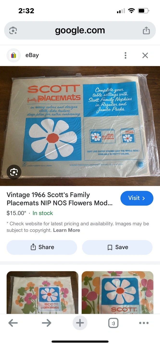 I have a set of vintage Scott's Family Placemats, still sealed in the original packaging! The package includes 24 paper placemats, each measuring 10" x 14". The placemats feature a fun floral design.