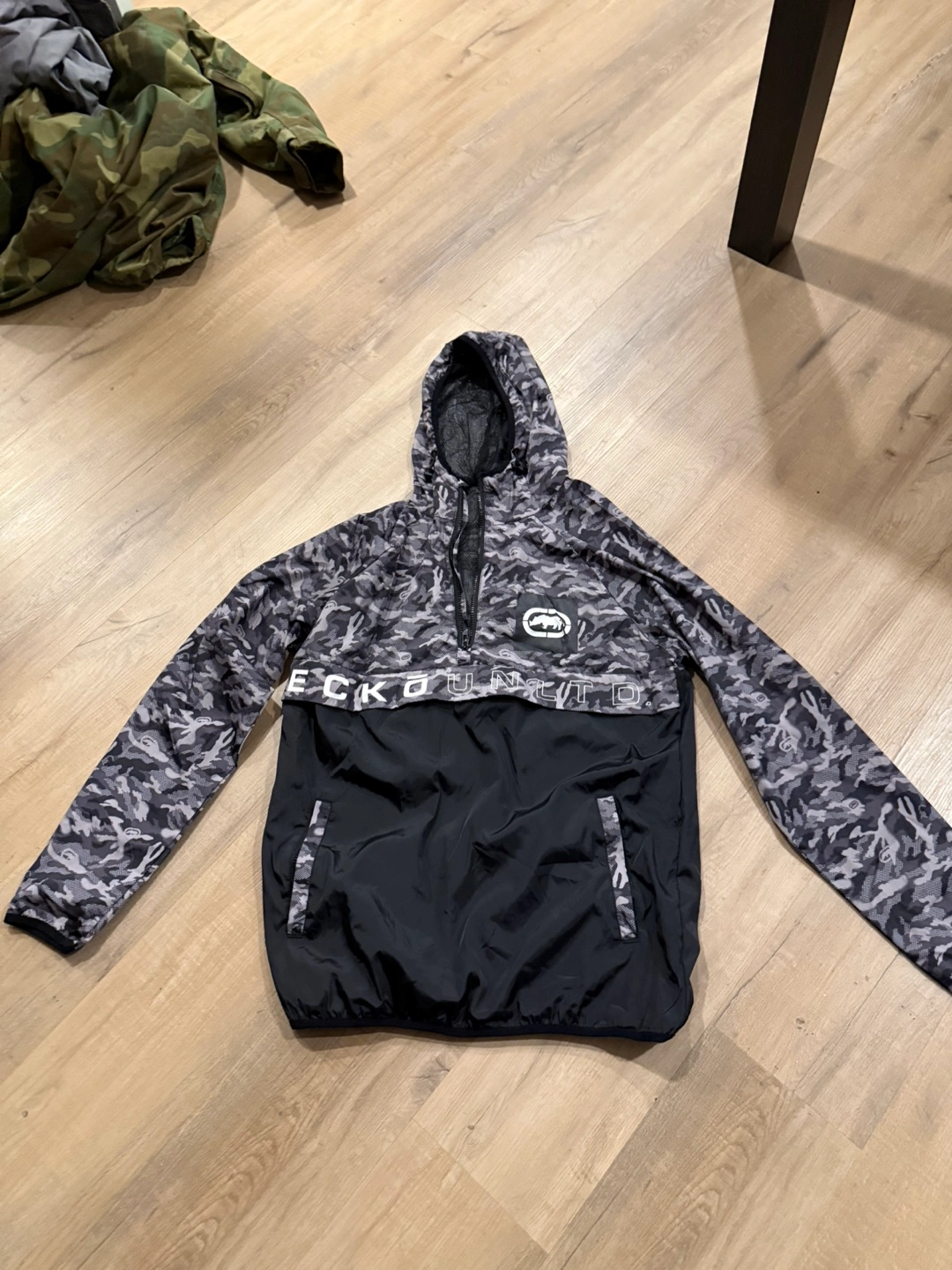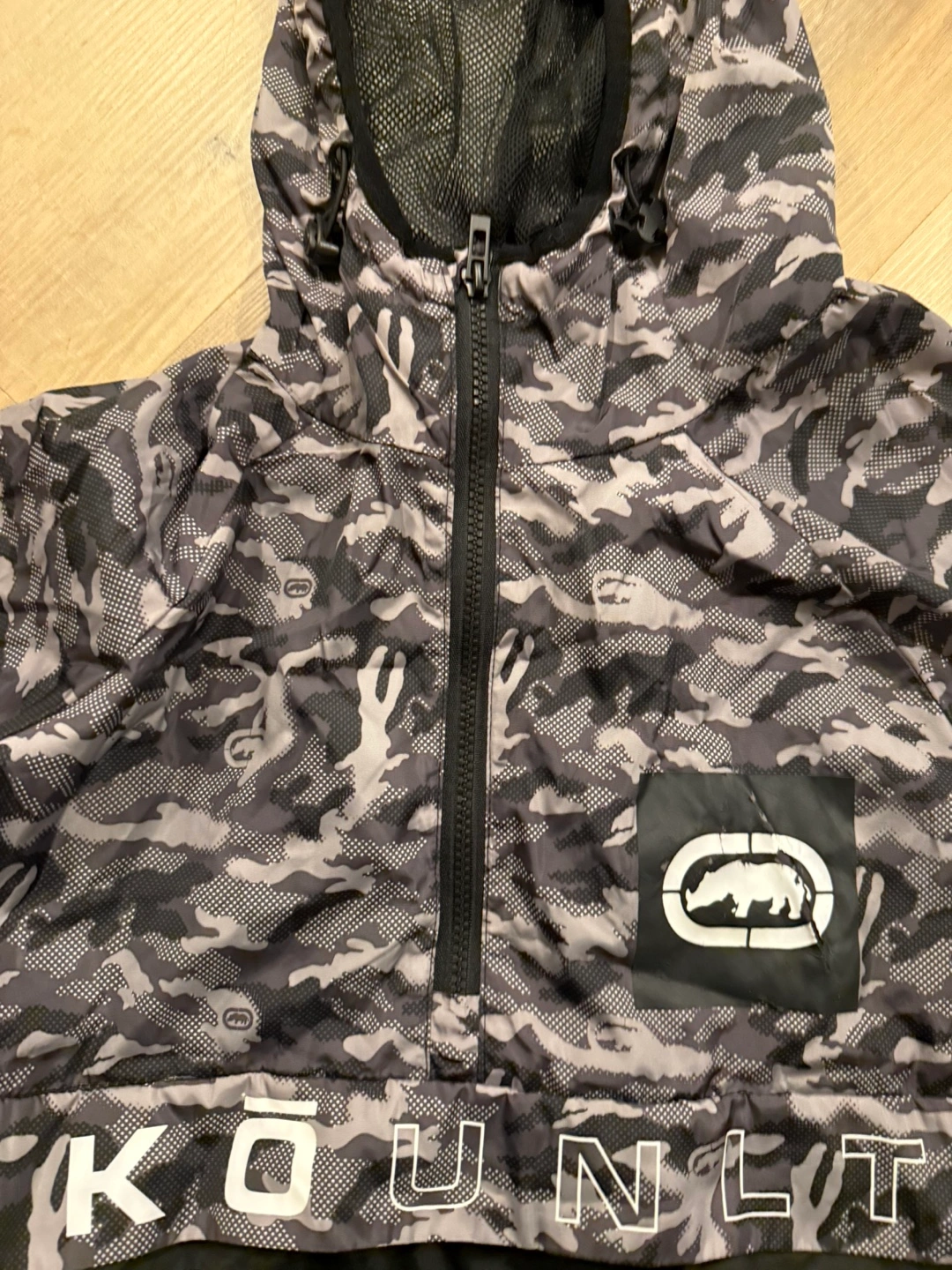 Selling an Ecko Unltd. pullover jacket in size medium! It features a cool camo pattern and the brand's logo. Perfect for layering or wearing on its own during milder weather.