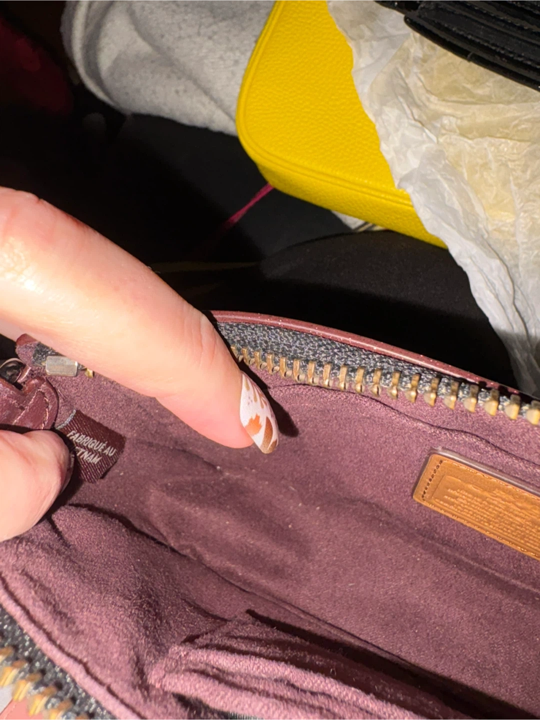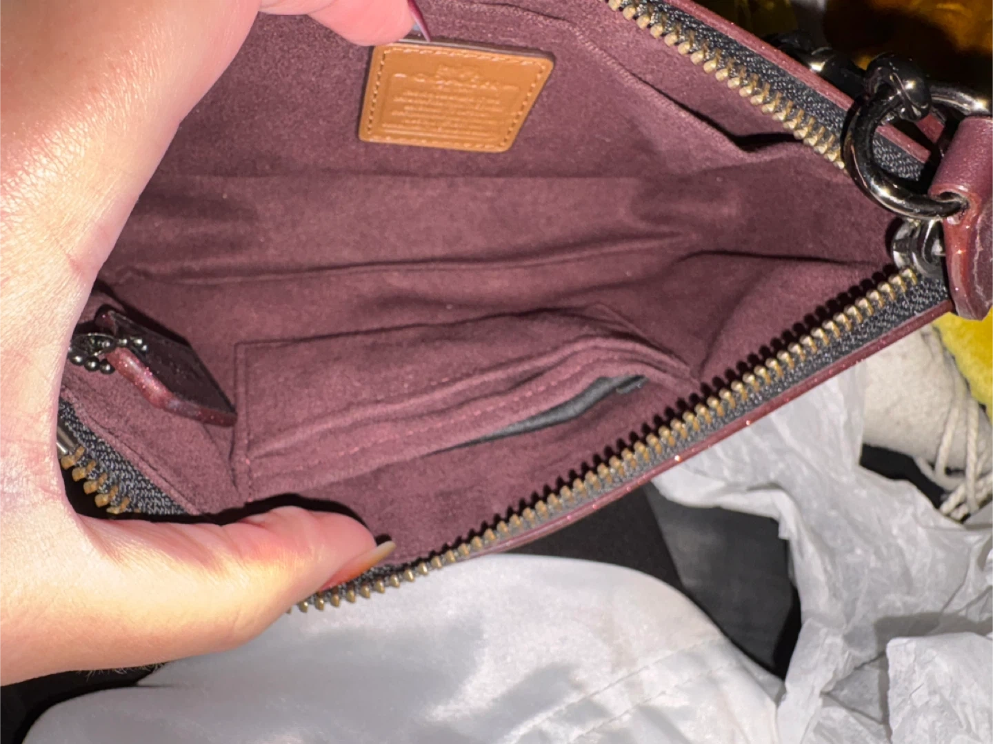 Selling a Coach dark red but I want to say purple patent leather bag with a chain strap! It's in great condition and perfect for a night out or everyday use. CASH ONLY!