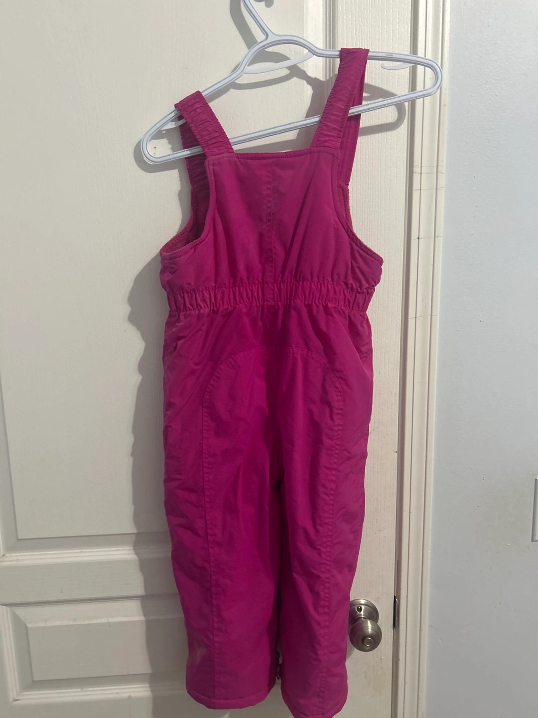 These snow pants from The Children's Place are in good condition. The only thing is that one of the straps is stretched out as shown in the pictures. They're a vibrant pink colour and perfect for keeping your little one warm and dry during snowy adventures. Size 4T
