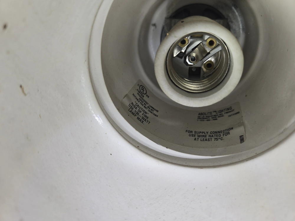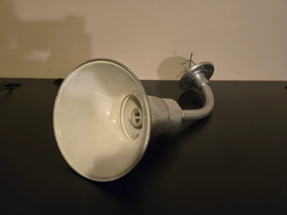 Abolite 930 Gooseneck Wall Light / Industrial Outdoor Fixture Genuine Abolite wall-mounted gooseneck light with porcelain enamel finish. Solid and reliable. Perfect for a garage, barn, shop, storefront, or industrial-style space. • Model: Abolite 930 (dated Dec 2003) • Uses standard E26 bulb (150W max) • Heavy-duty steel construction • Porcelain enamel shade with white interior • Original gooseneck arm with mounting plate • UL listed • Wiring is intact and ready to install Approx. dimensions: • Shade diameter: around 12–14 inches • Arm projection: about 18 inches Condition: • Good used shape • No cracks or major chips in the enamel • Light patina and wear consistent with age Price: 40CAD Cash preferred / eTransfer accepted All sales are final / Delivery may be available for an additional cost Check out my other ads