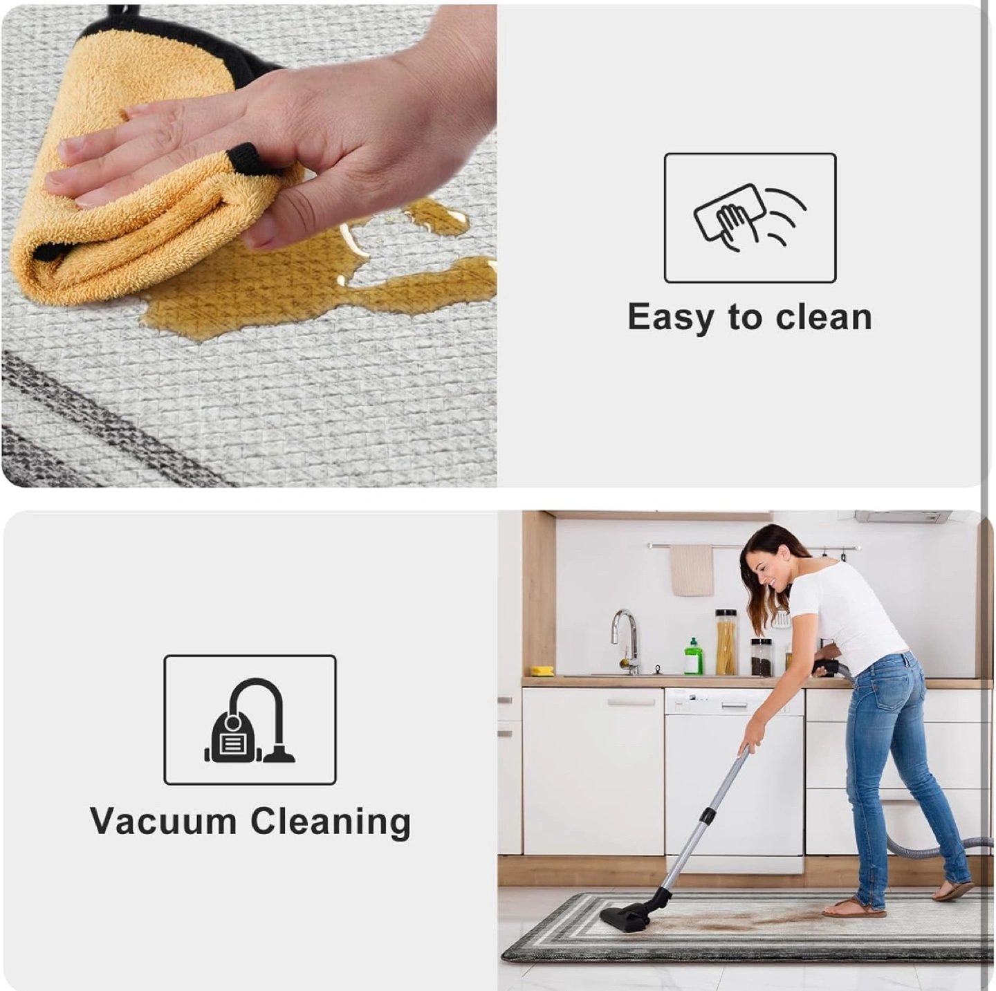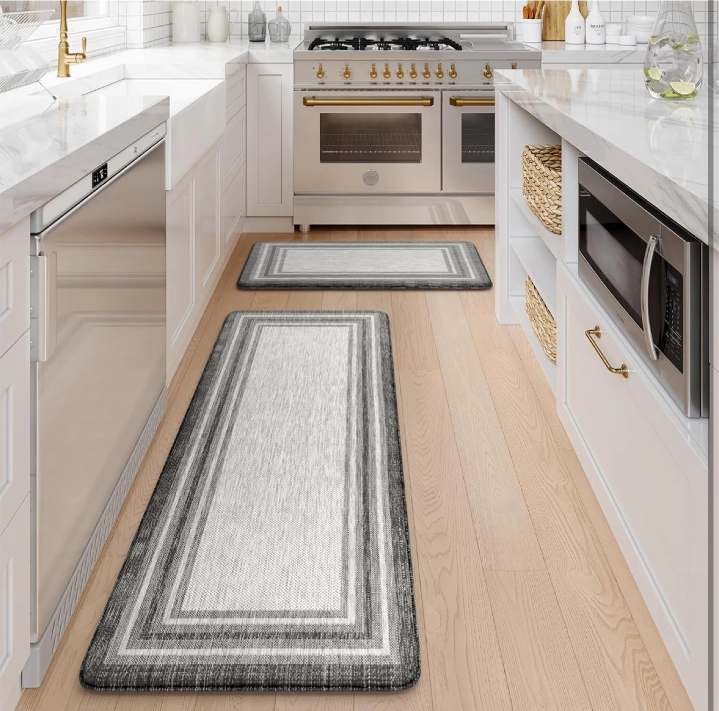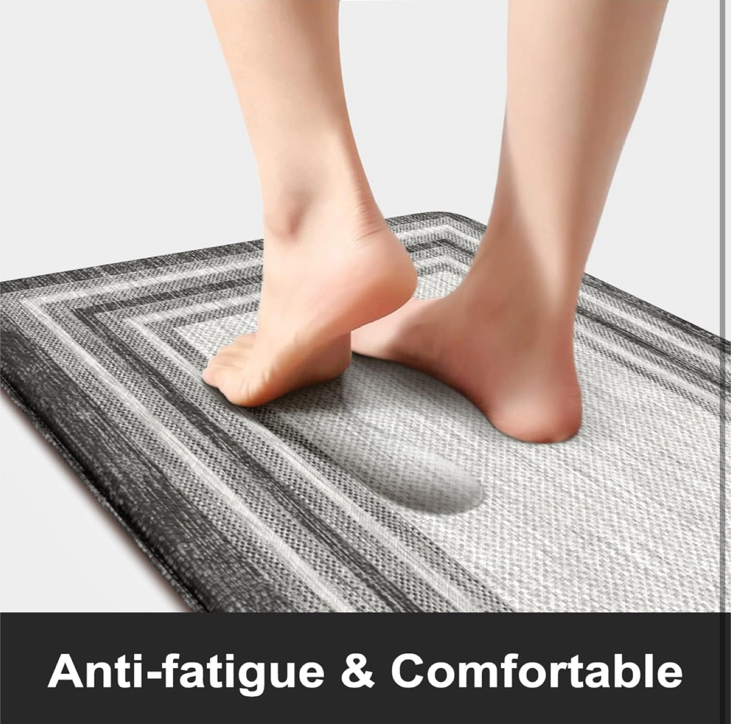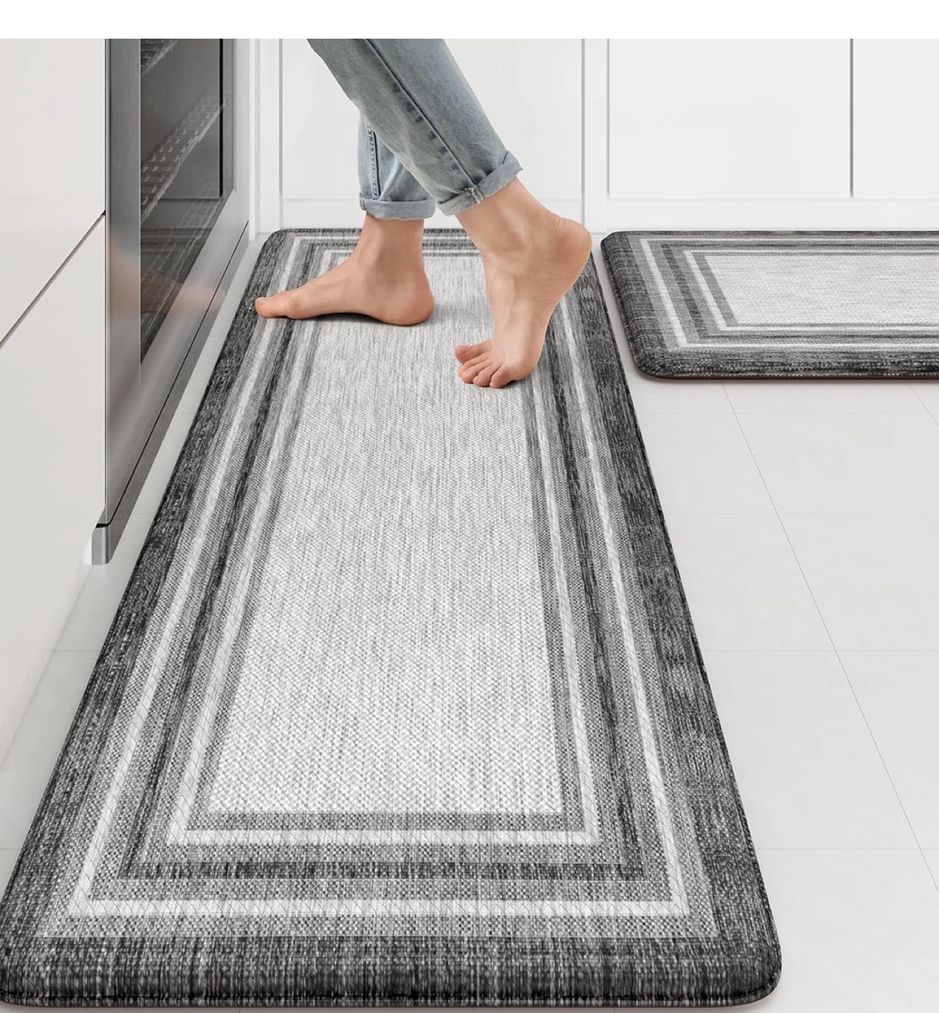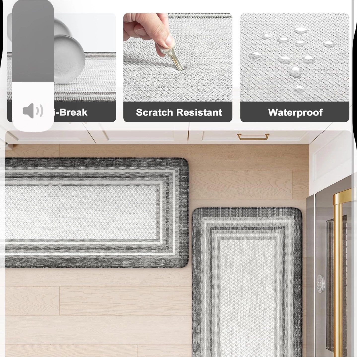 This is a set of two anti-fatigue kitchen mats. They are easy to clean and vacuum-friendly. The mats are also scratch-resistant and waterproof. One mat is 29" x 17.3" and the other is 47" x 17.3" and both are 0.47" thick!