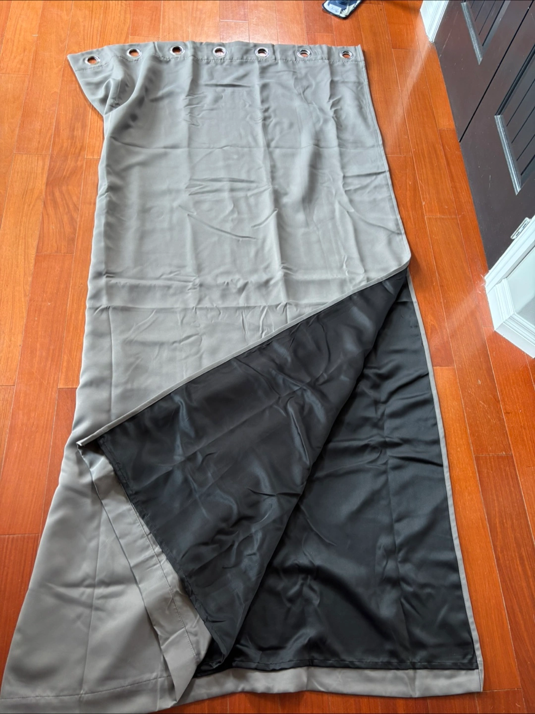 Selling a set of two blackout curtains in a neutral grey colour with a dark grey/black lining. They're in great condition and ready to block out the light in your space! Width of one panel is 97”, and length of one panel is 92”. Great quality, nice and thick!!