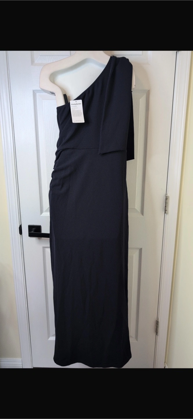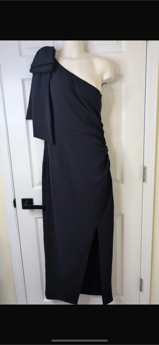 New with tag! Retails for $80 Here's a stylish navy blue one-shoulder maxi dress. It features a bow detail on the shoulder and a flattering silhouette. Perfect for a special occasion or evening out!