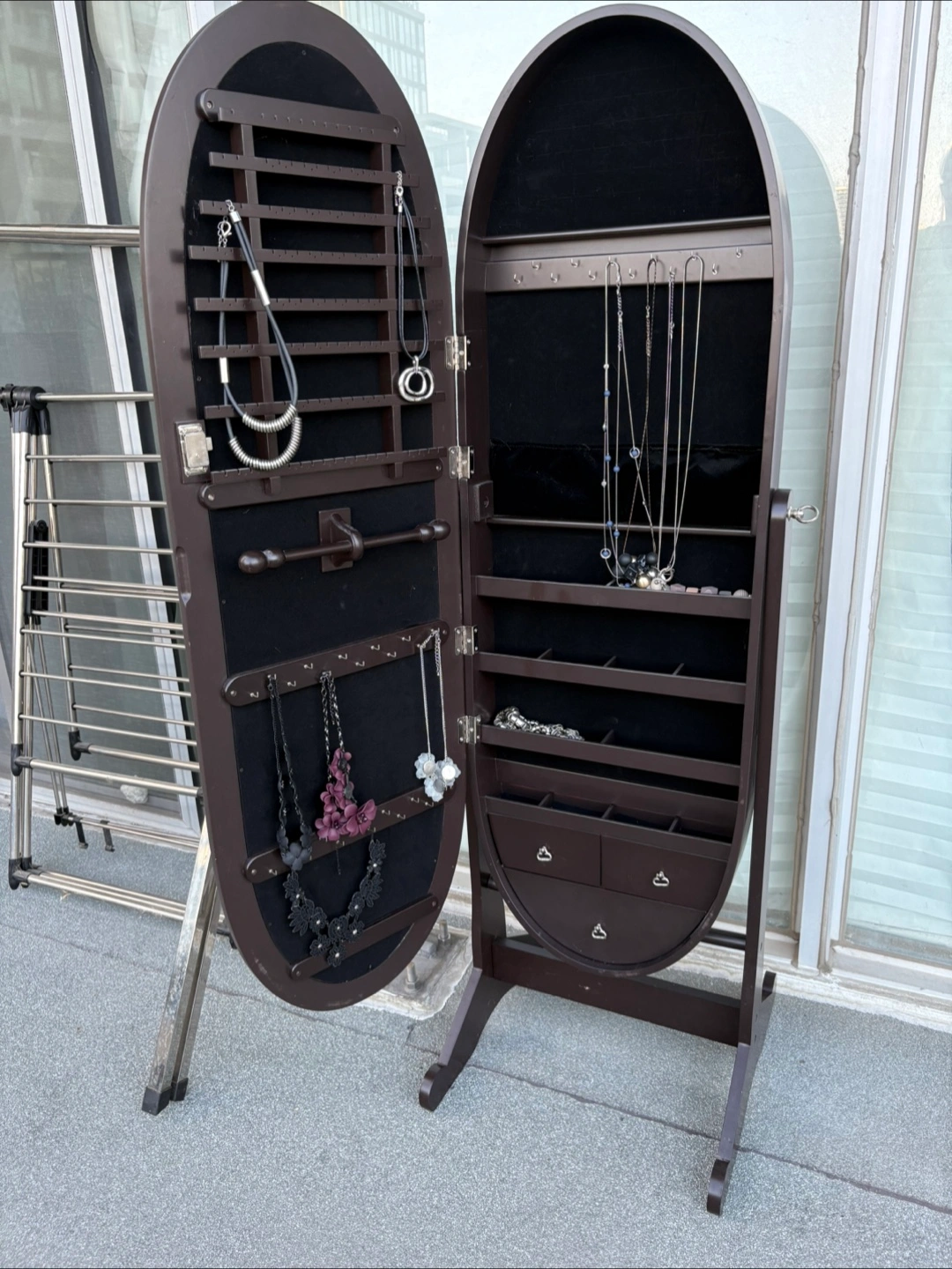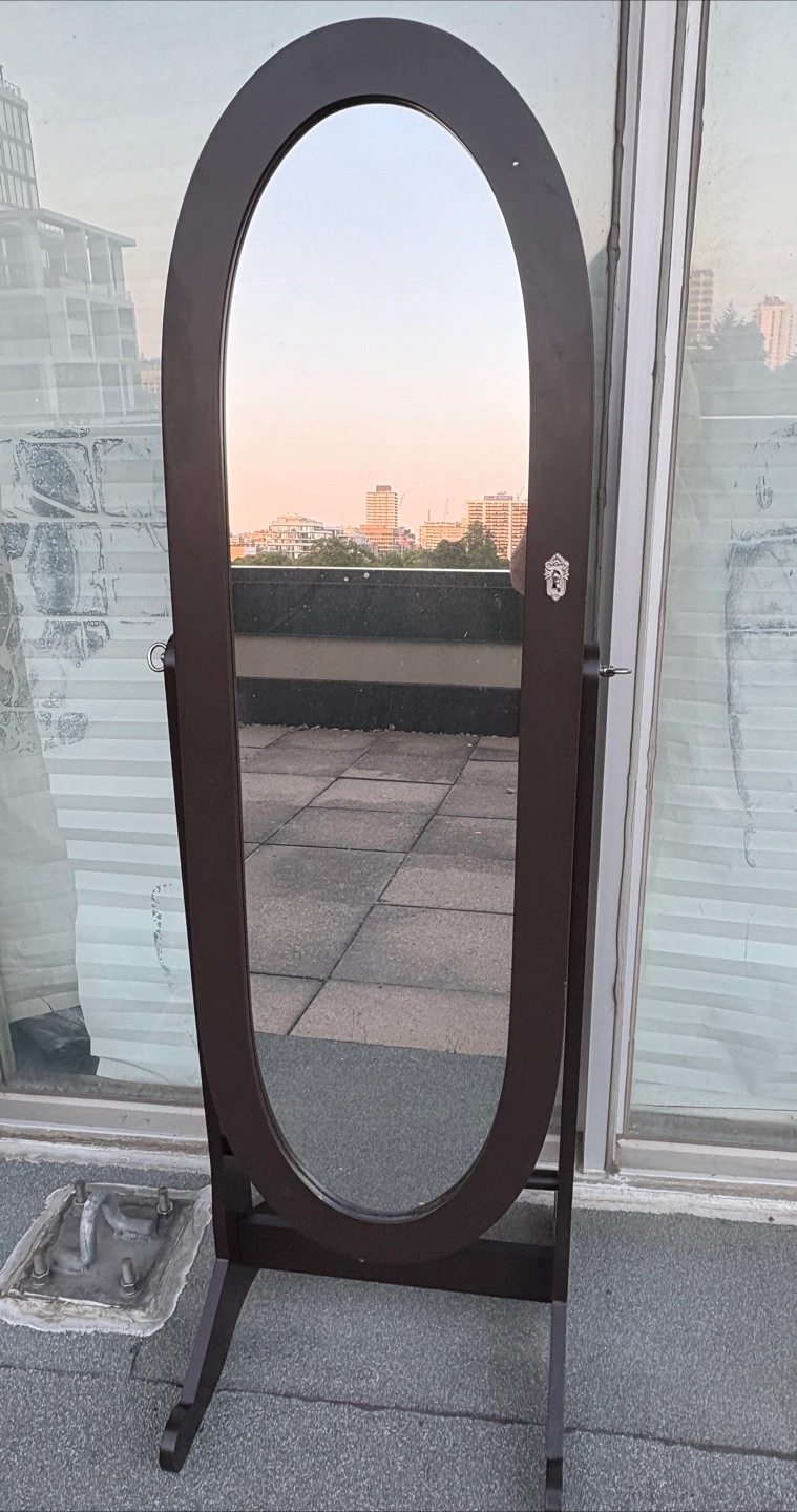 Selling a standing oval jewellery armoire mirror in brown. It locks and key is in door. It's in great shape and perfect for organizing your accessories. It has lots of space for necklaces, bracelets, and earrings! Yonge/Eglinton pick up