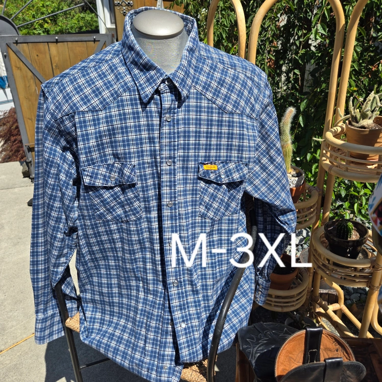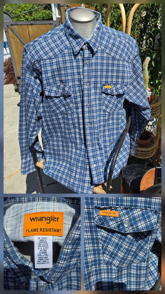 Wrangler Flame Resistant shirt in size 3XL. It's a blue and white plaid pattern and in great condition. Perfect for work or casual wear!