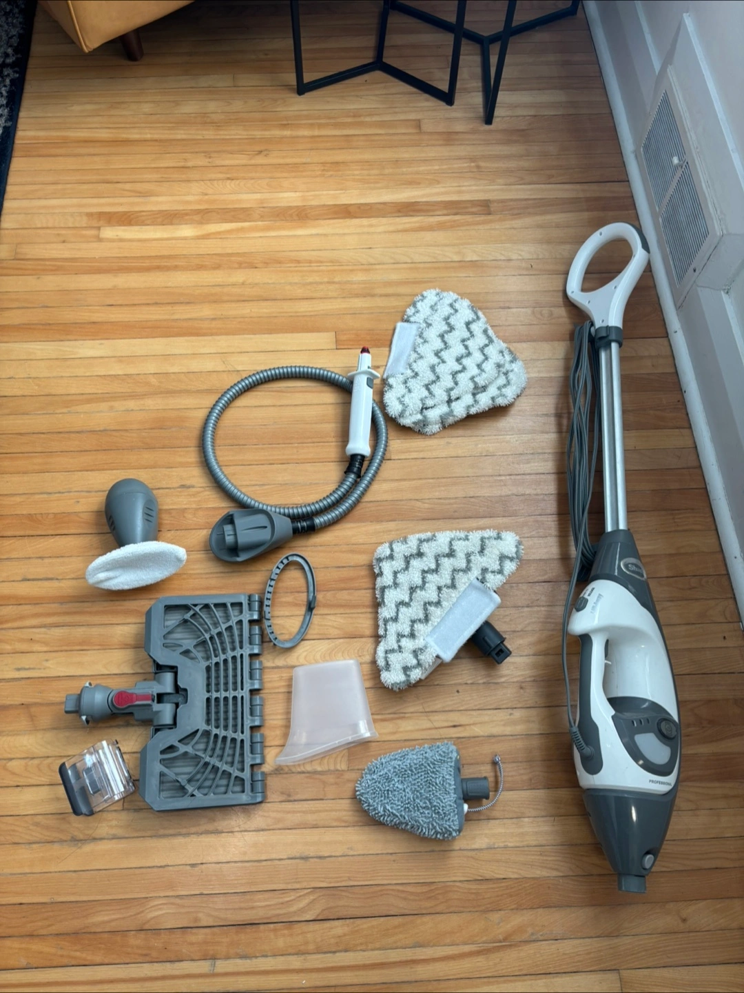 Selling a Shark Professional Steam Mop! It comes with all the attachments you see in the photos. This mop is great for keeping your floors clean and sparkling. It's in good condition and ready for a new home! You will have to purchase a fresh rectangle cloth for it.