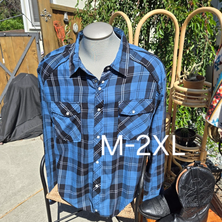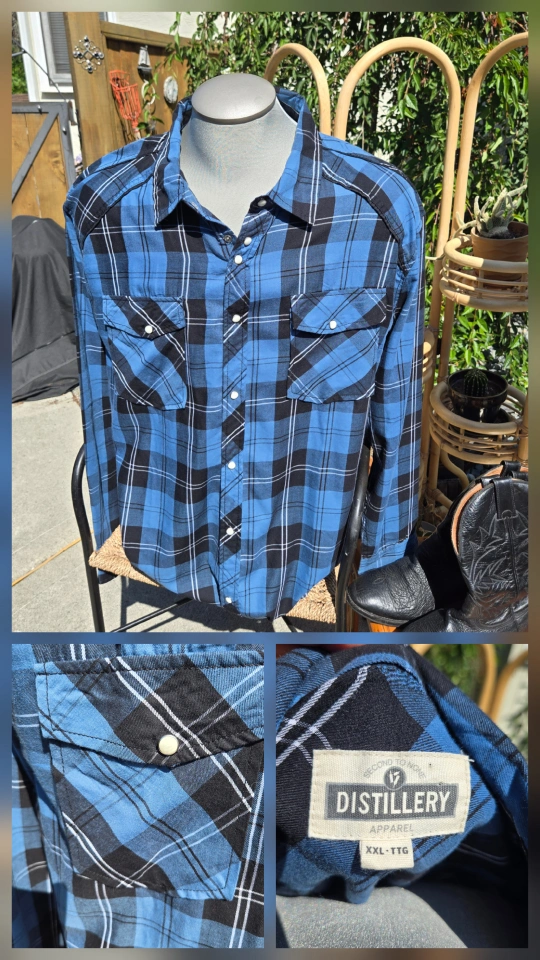 SUNFEST TIME! Here's a Distillery Apparel western shirt in size 2XL! It features a blue and black plaid pattern and classic western styling.