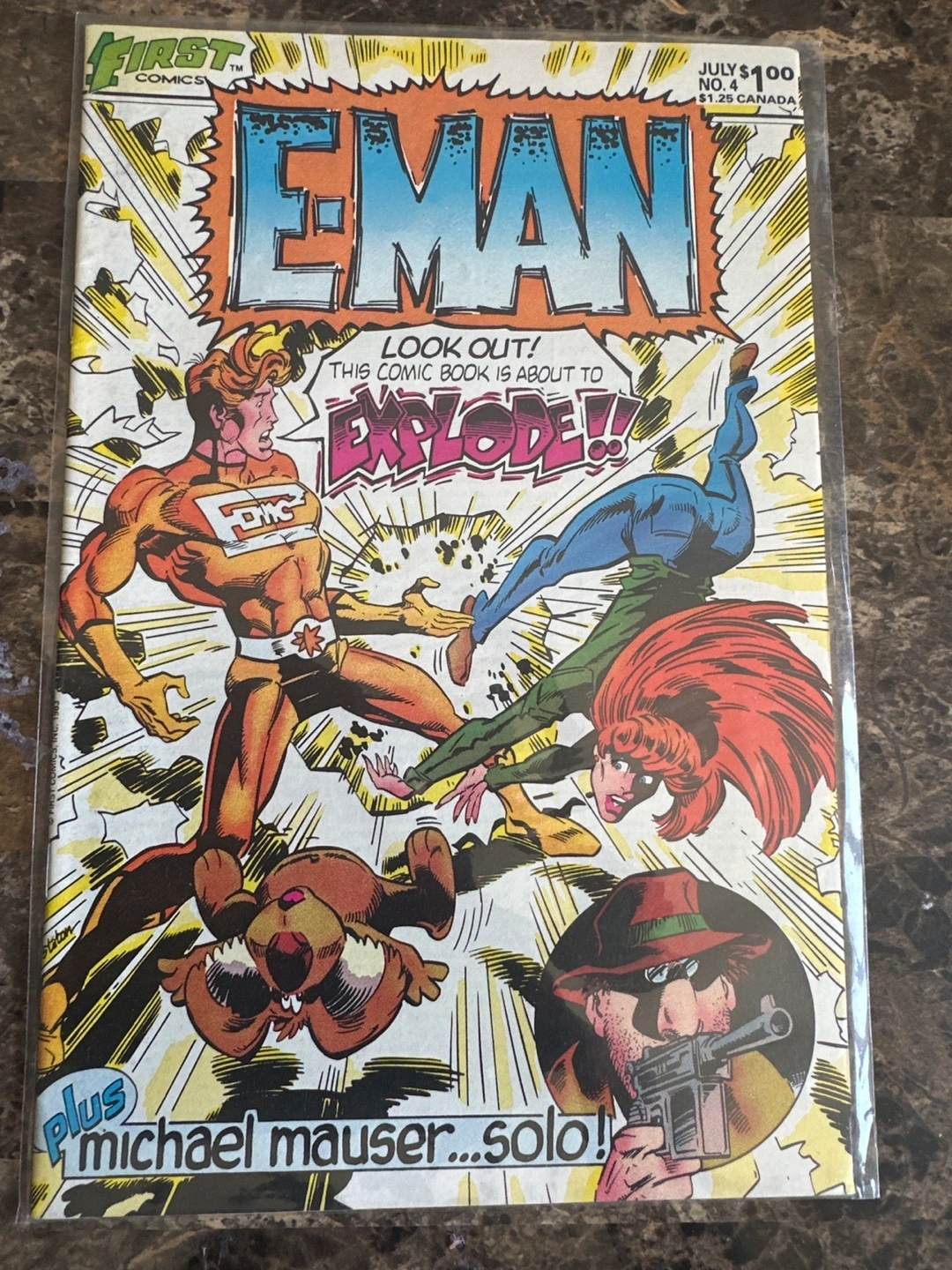 Selling E-Man Comic Book No. 4 from First Comics! This comic book is about to explode! Plus, it features Michael Mauser...solo!