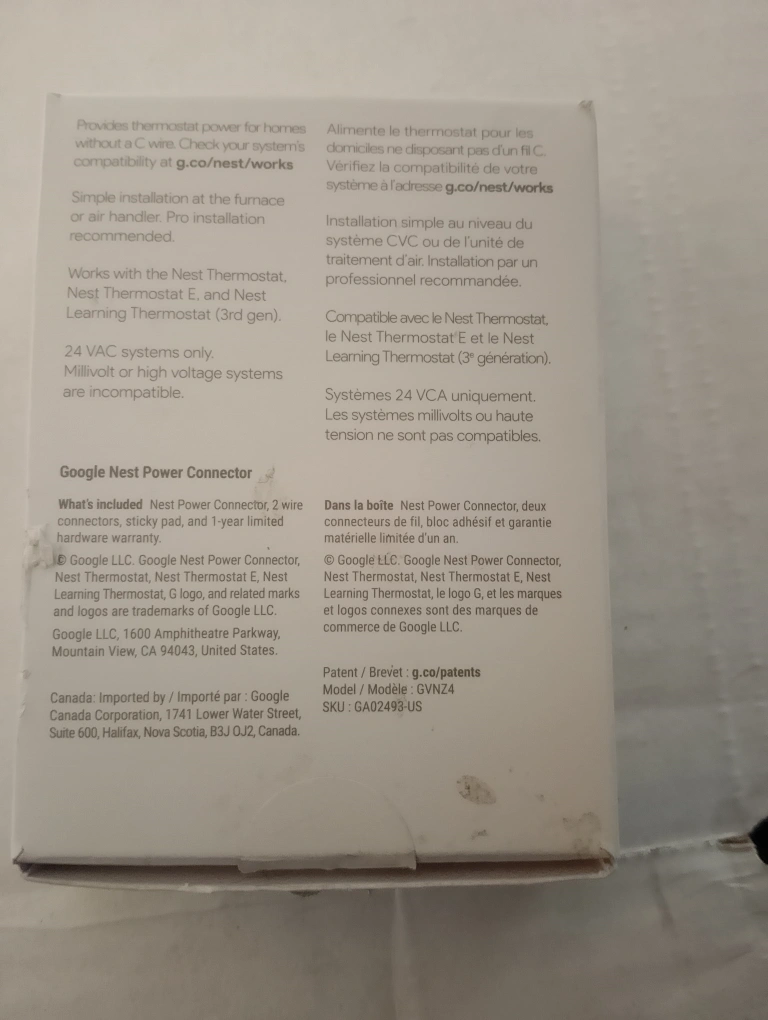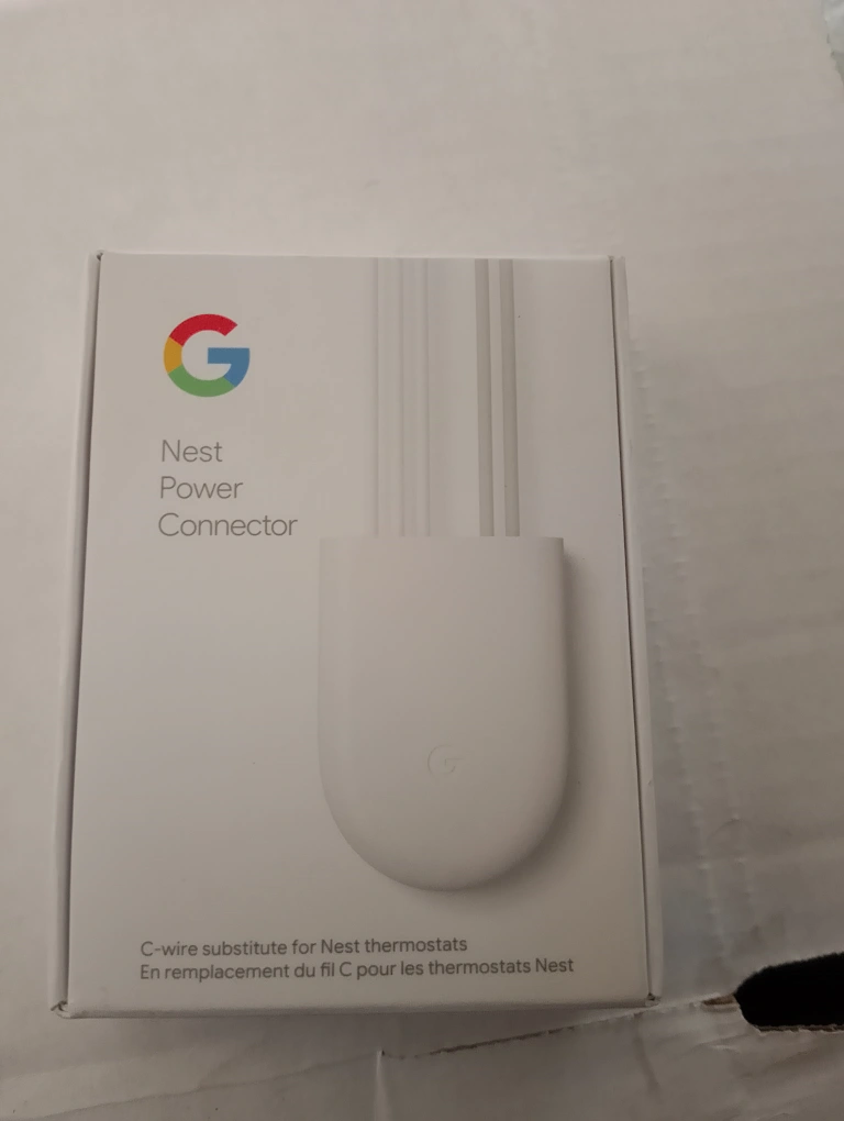 Selling a brand new Google Nest Power Connector, still in its original box! This is a C-wire substitute for Nest thermostats, providing thermostat power for homes without needing a C-wire. Simple installation at the furnace or air handler is recommended. It works with the Nest Thermostat E and Nest Learning Thermostat (3rd gen). The box includes the Nest Power Connector, two wire connectors, a sticky pad, and a 1-year limited hardware warranty