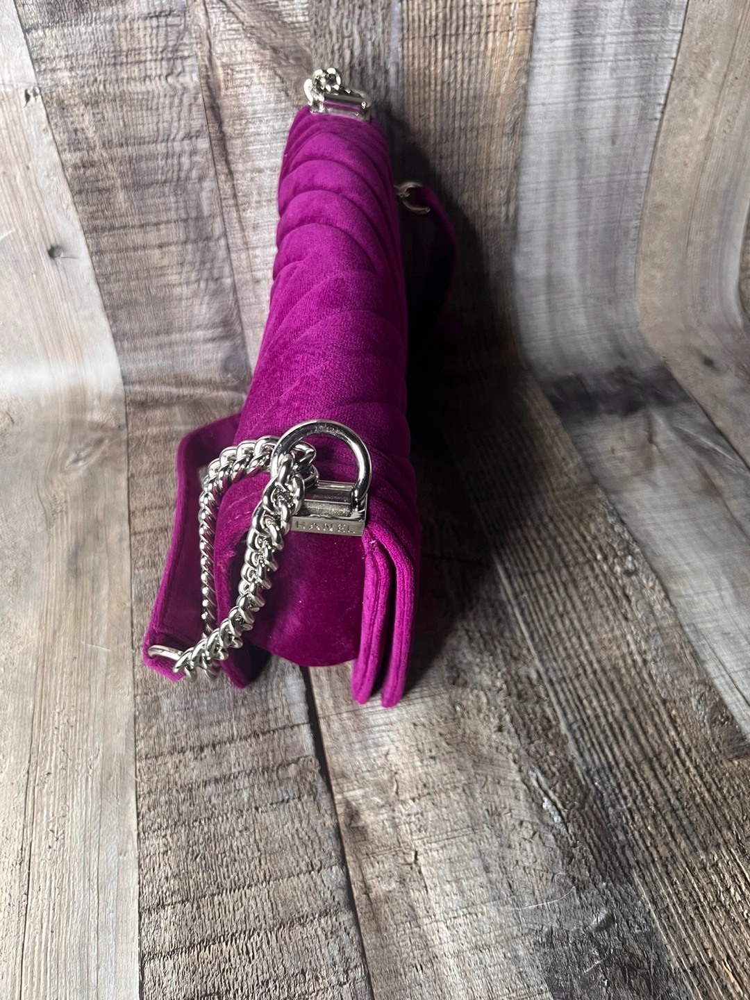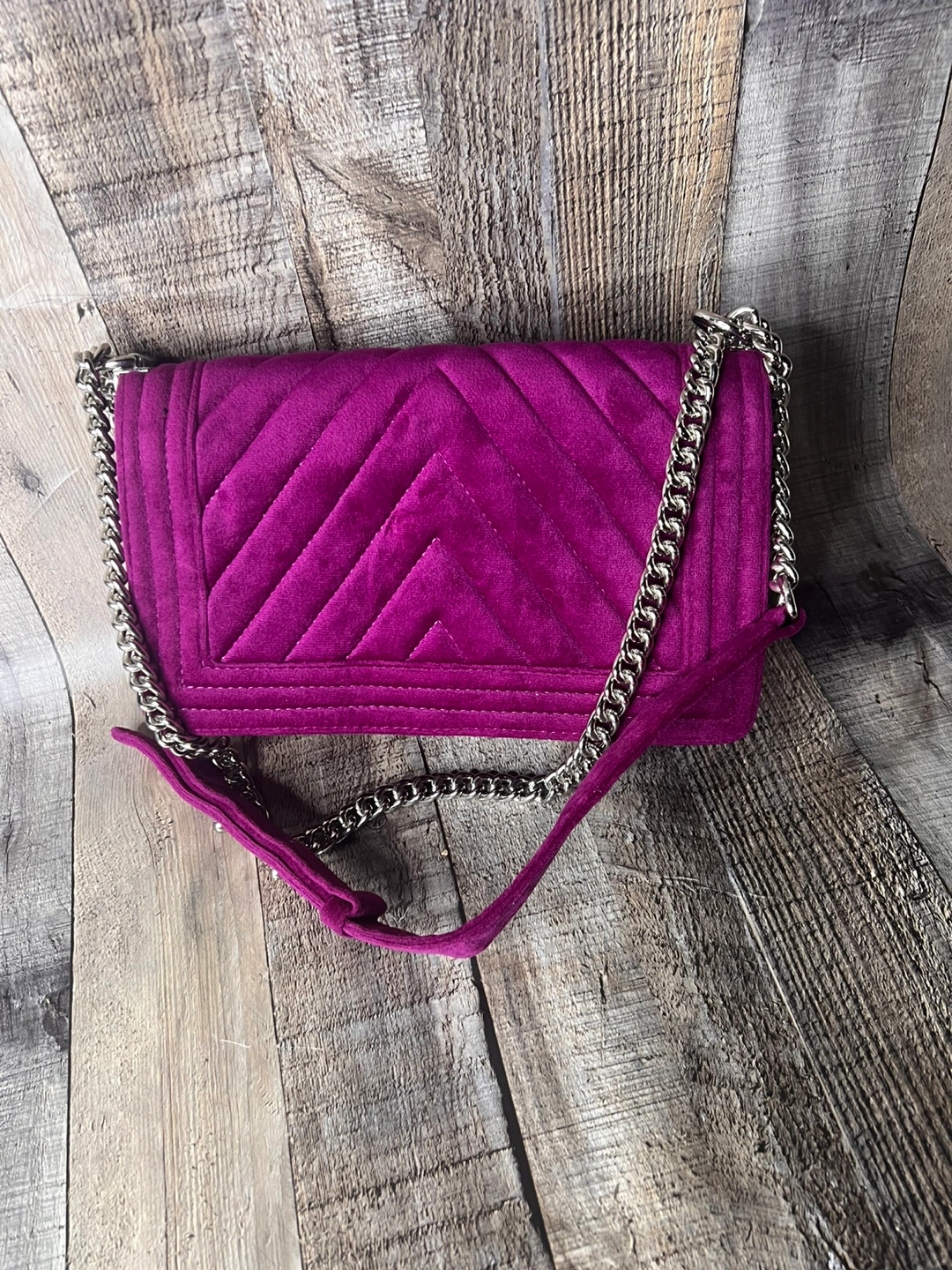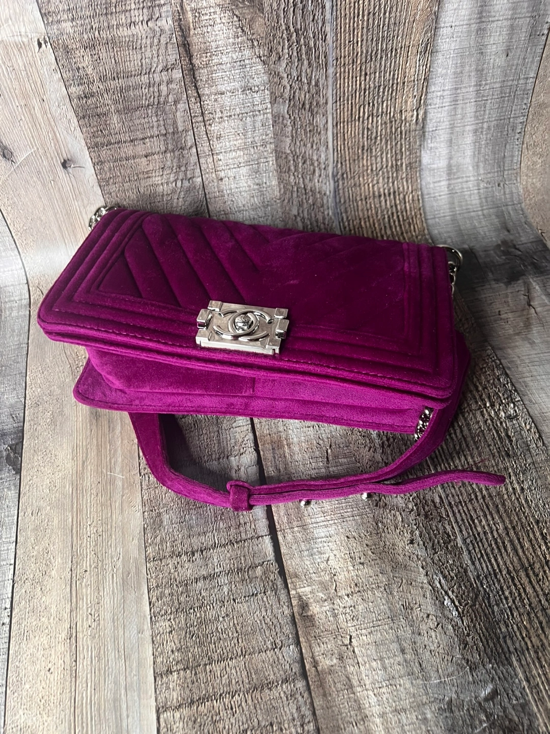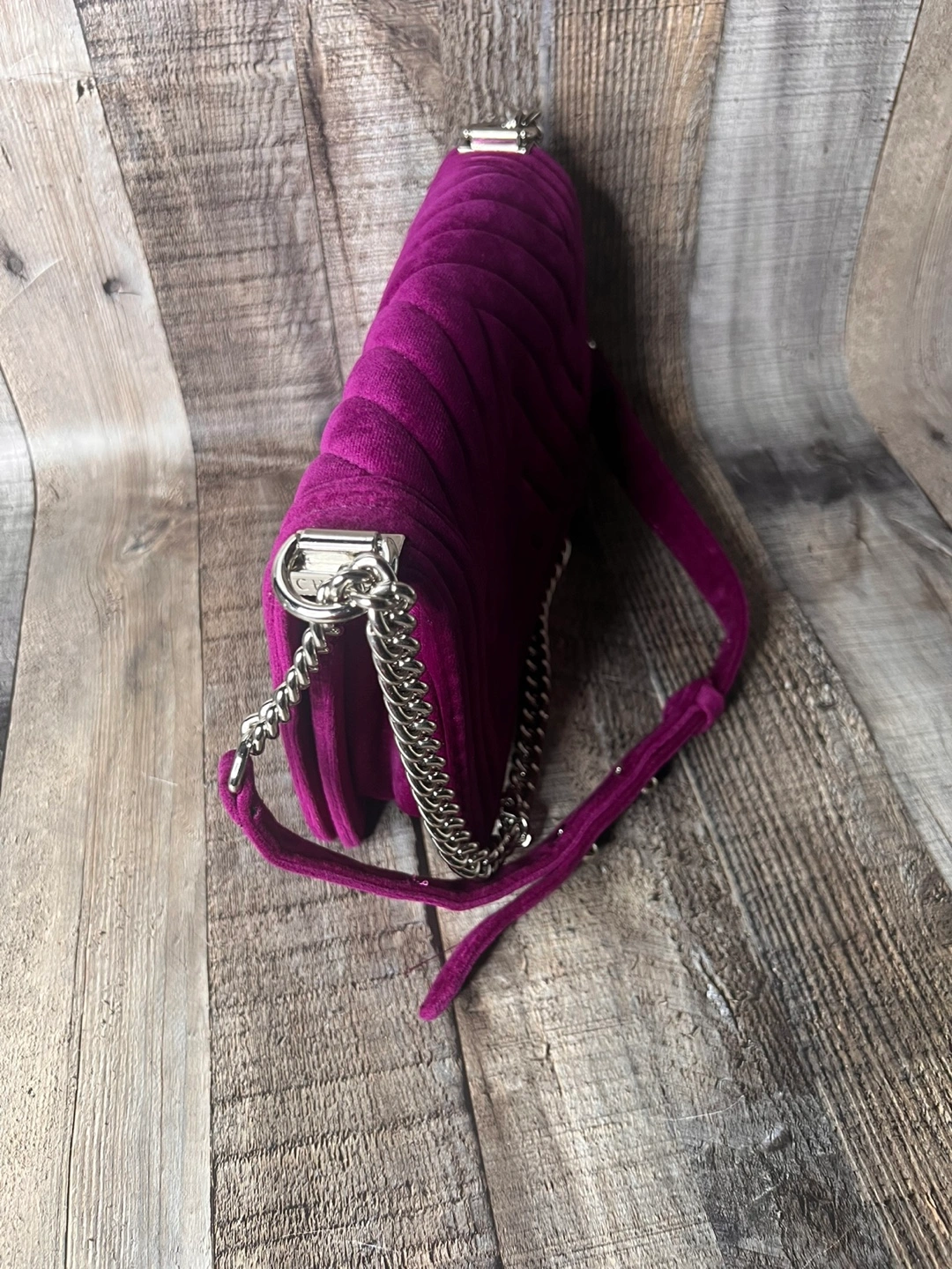 This is a beautiful purple velvet shoulder bag with a chevron pattern. It features a silver chain strap and hardware. The bag is in great condition and perfect for adding a pop of colour to your outfit. Price reflects authenticity.