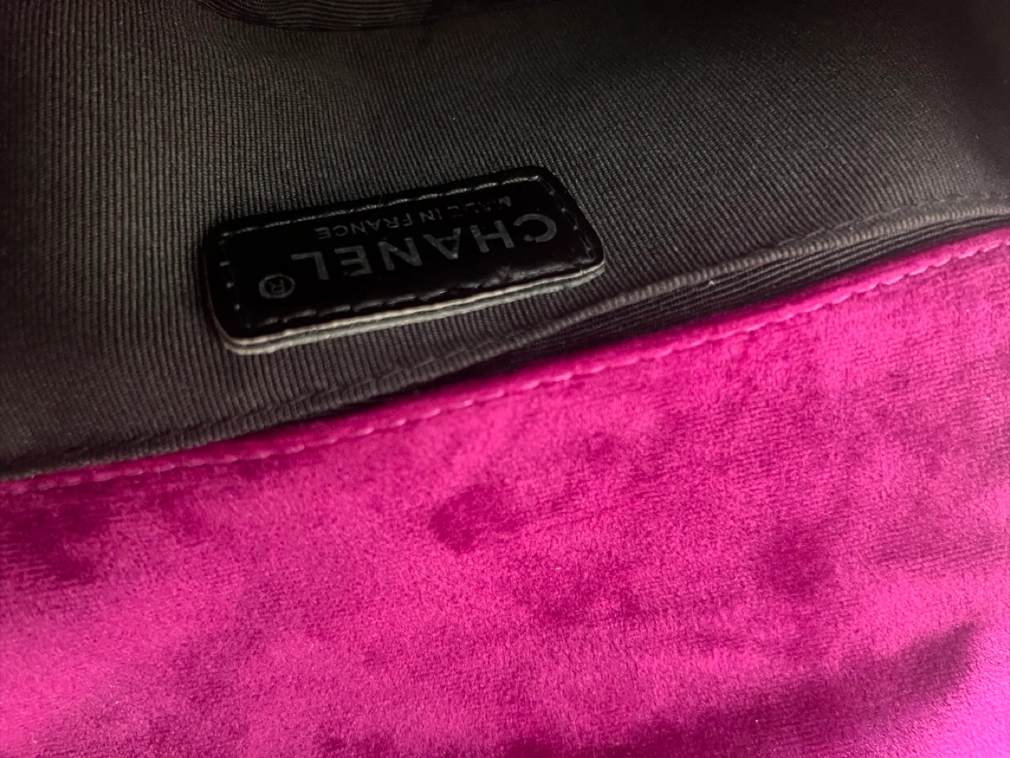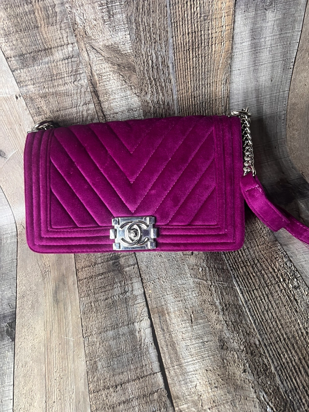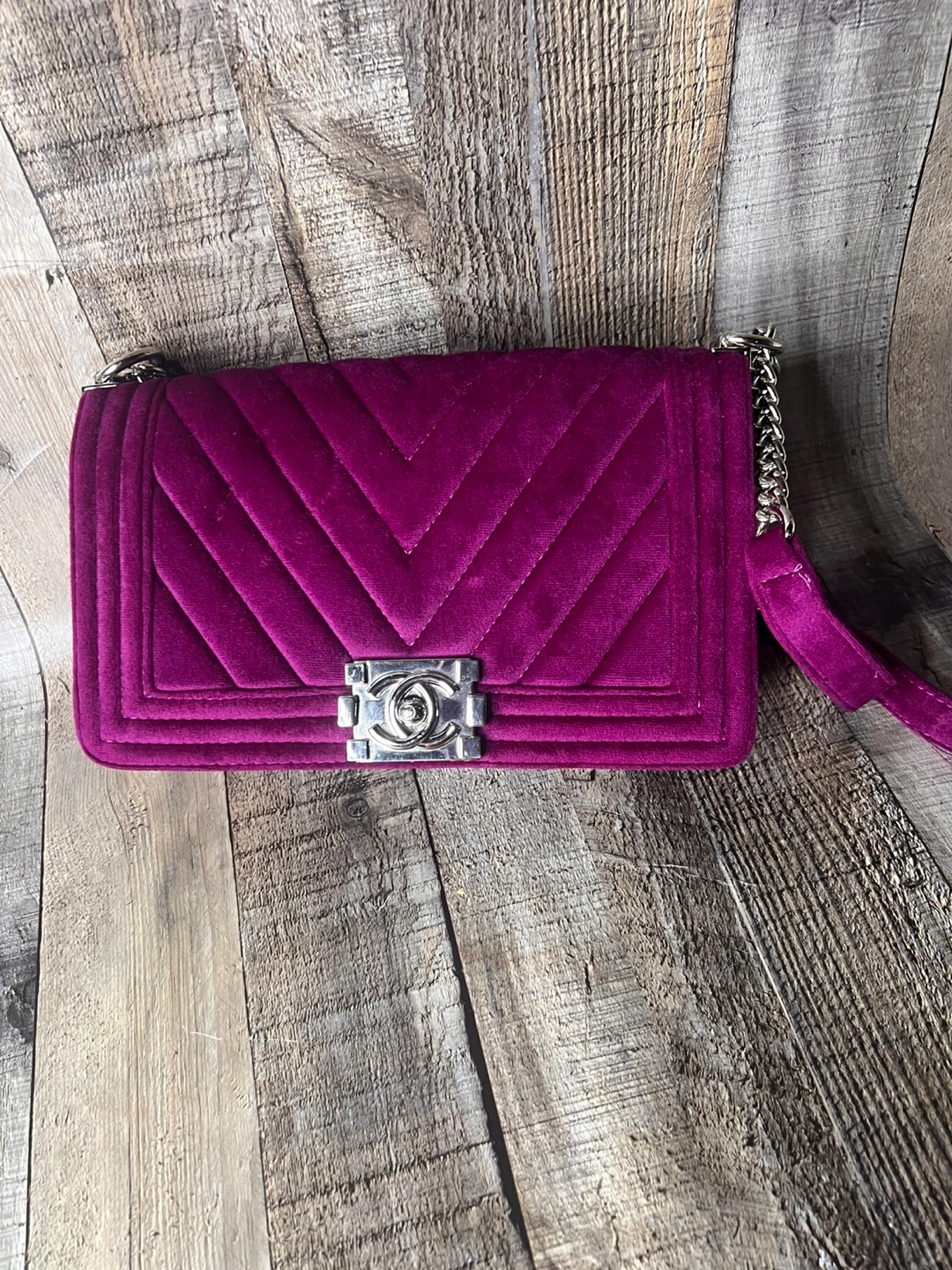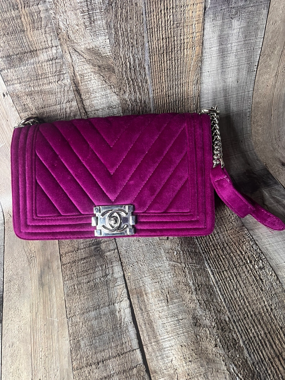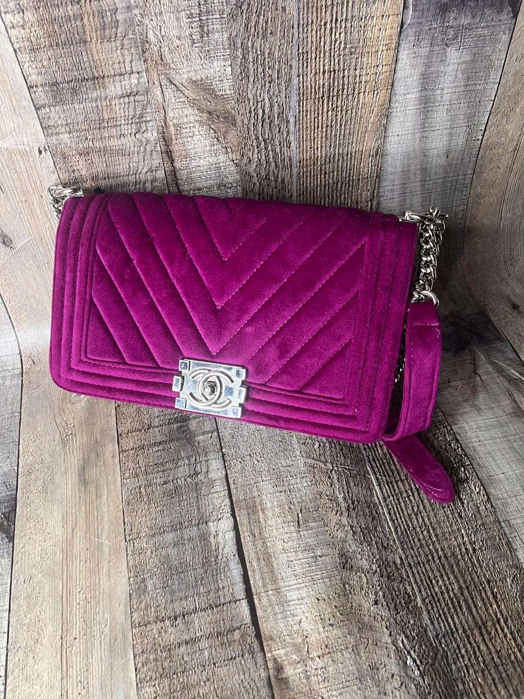 This is a beautiful purple velvet shoulder bag with a chevron pattern. It features a silver chain strap and hardware. The bag is in great condition and perfect for adding a pop of colour to your outfit. Price reflects authenticity.