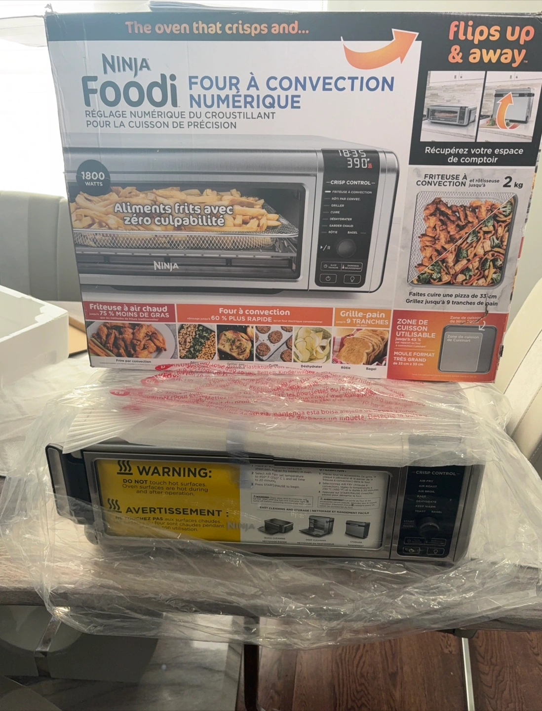 Selling a Ninja Foodi digital air fry oven. It crisps, flips up, and away! It's in like-new condition and comes with the original box. Enjoy guilt-free fried foods with air frying, which uses 75% less fat! This oven is a convection oven that cooks up to 60% faster than traditional ovens. It also has a 9-slice capacity and can make a 33x33cm pizza! It's a great size for any kitchen