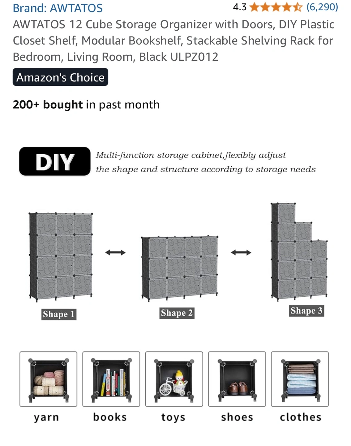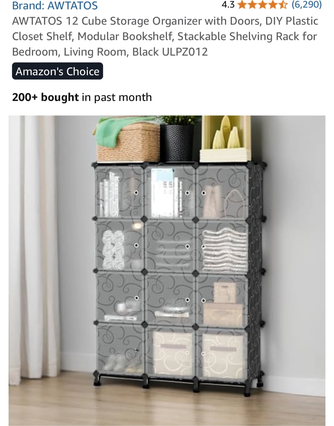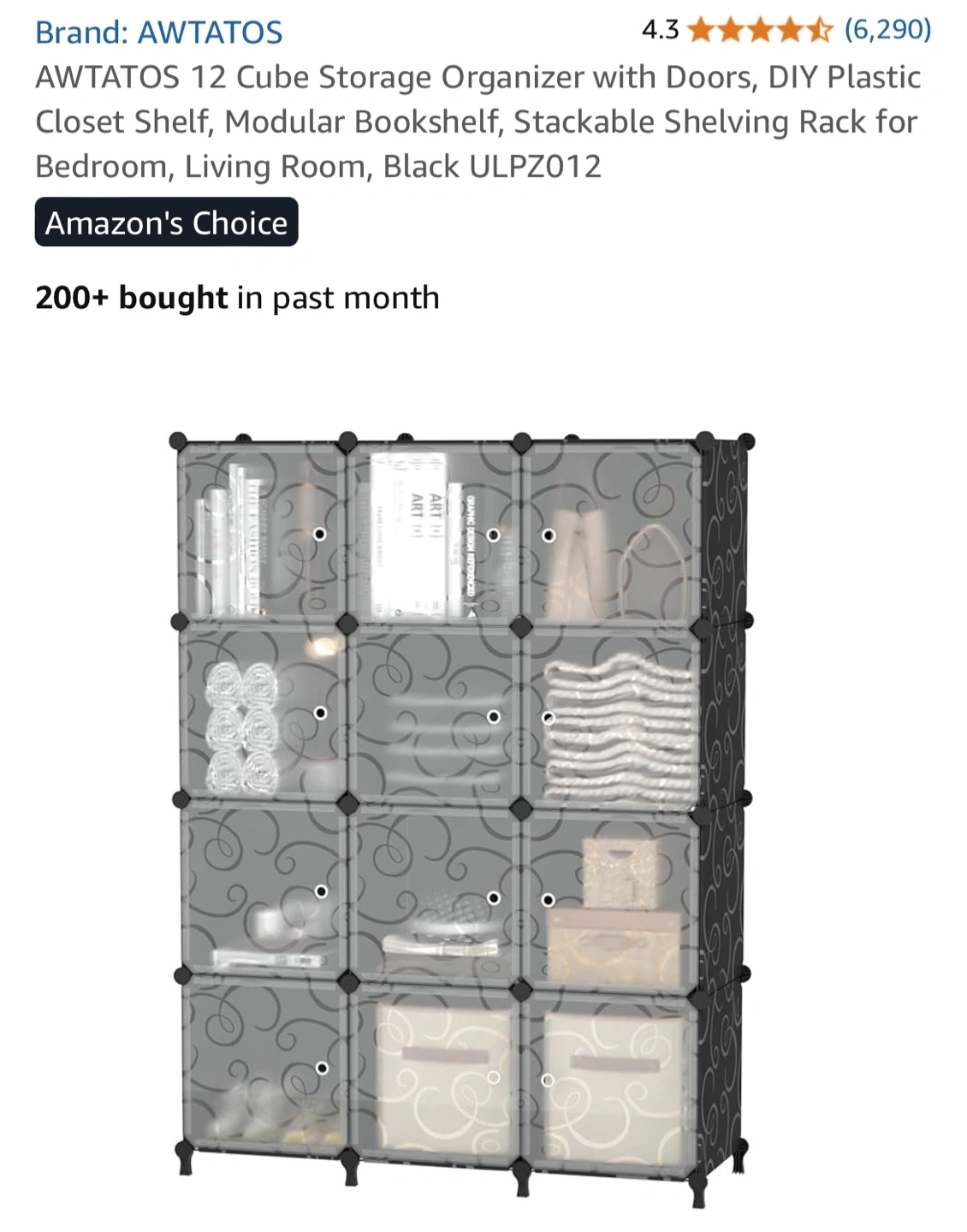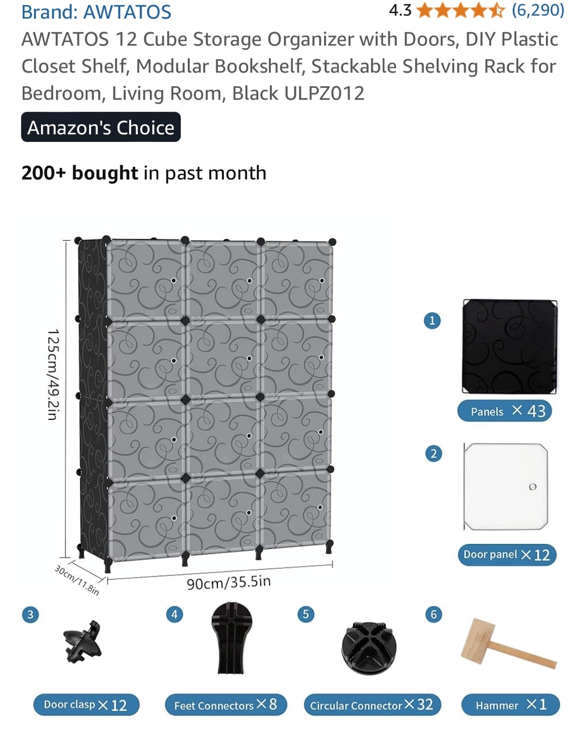 This AWTATOS 12 Cube Storage Organizer is perfect for adding some modular shelving to any room! It's a DIY plastic closet shelf that can be used as a bookshelf or shelving rack. Key features: - Stackable - Includes doors - Dimensions: 125cm/49.2in x 90cm/35.5in x 30cm/11.8in Included components: - Panels x 43 - Door panel x 12 - Door clasp x 12 - Feet Connectors x 8 - Circular Connector x 32 - Hammer x 1