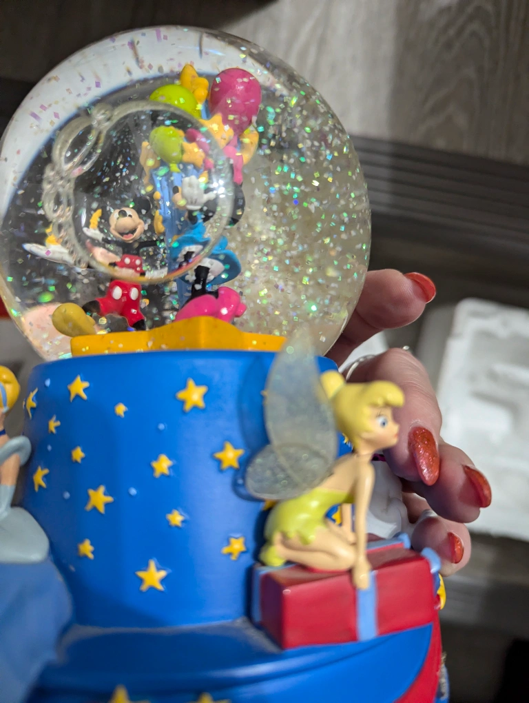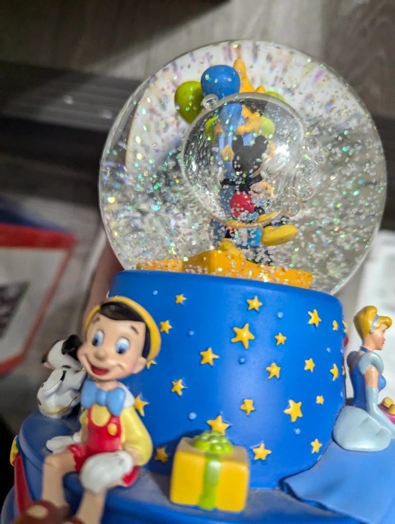 Selling a Disney 100th Anniversary musical snow globe! It features classic characters like Mickey Mouse, Pinocchio, Cinderella, and Tinkerbell. It's a charming decorative piece for any Disney fan