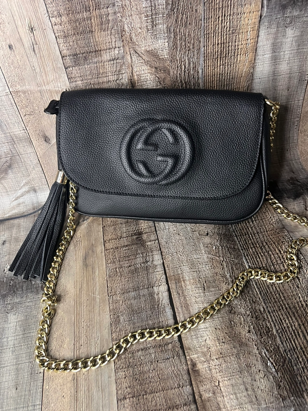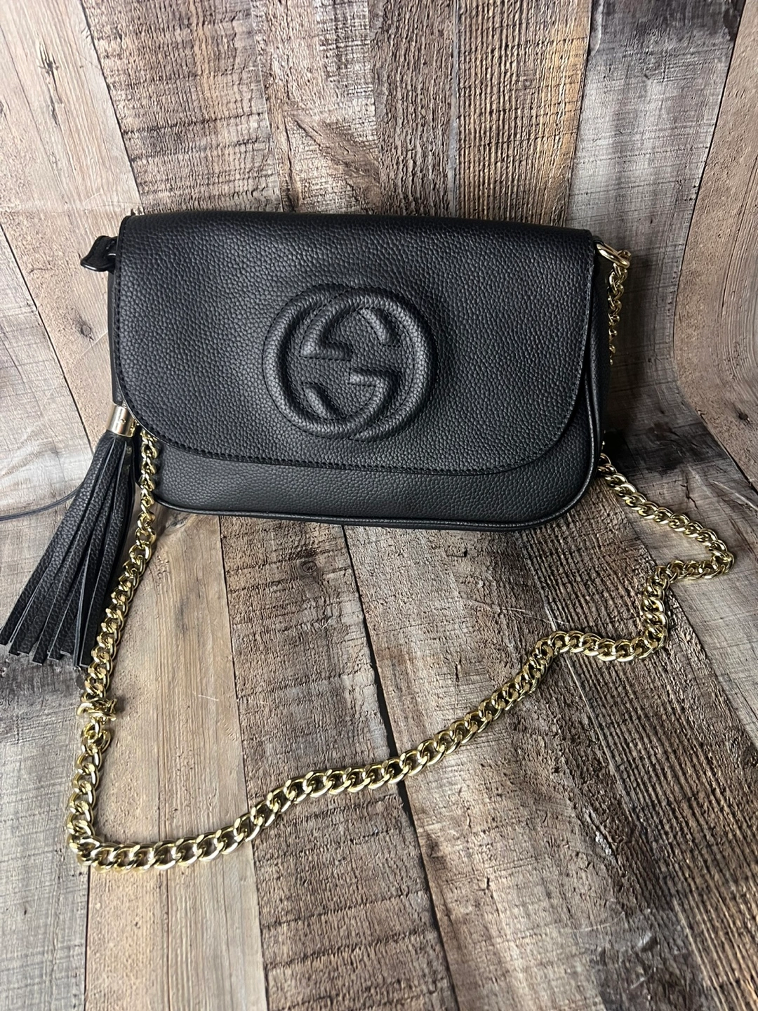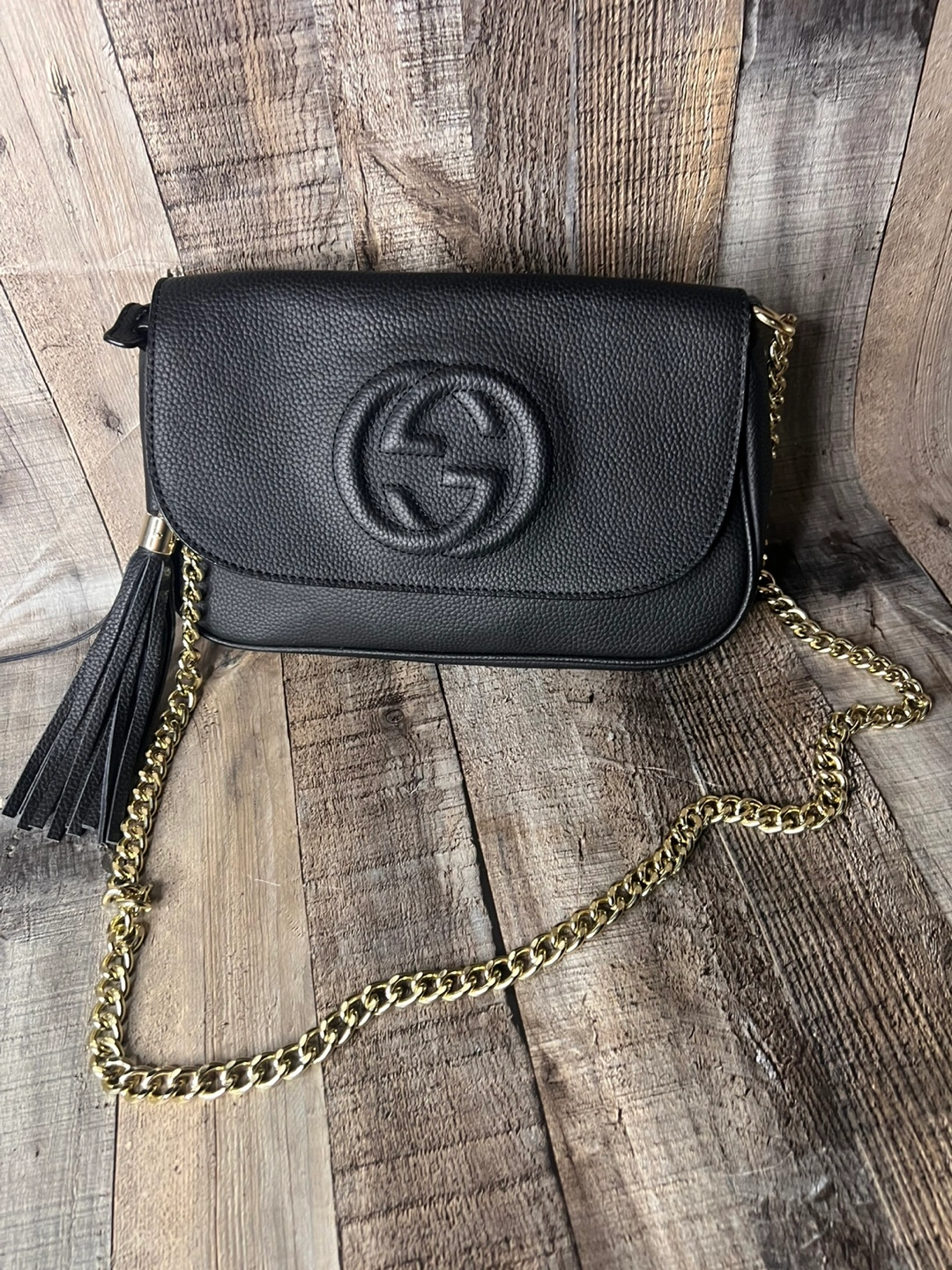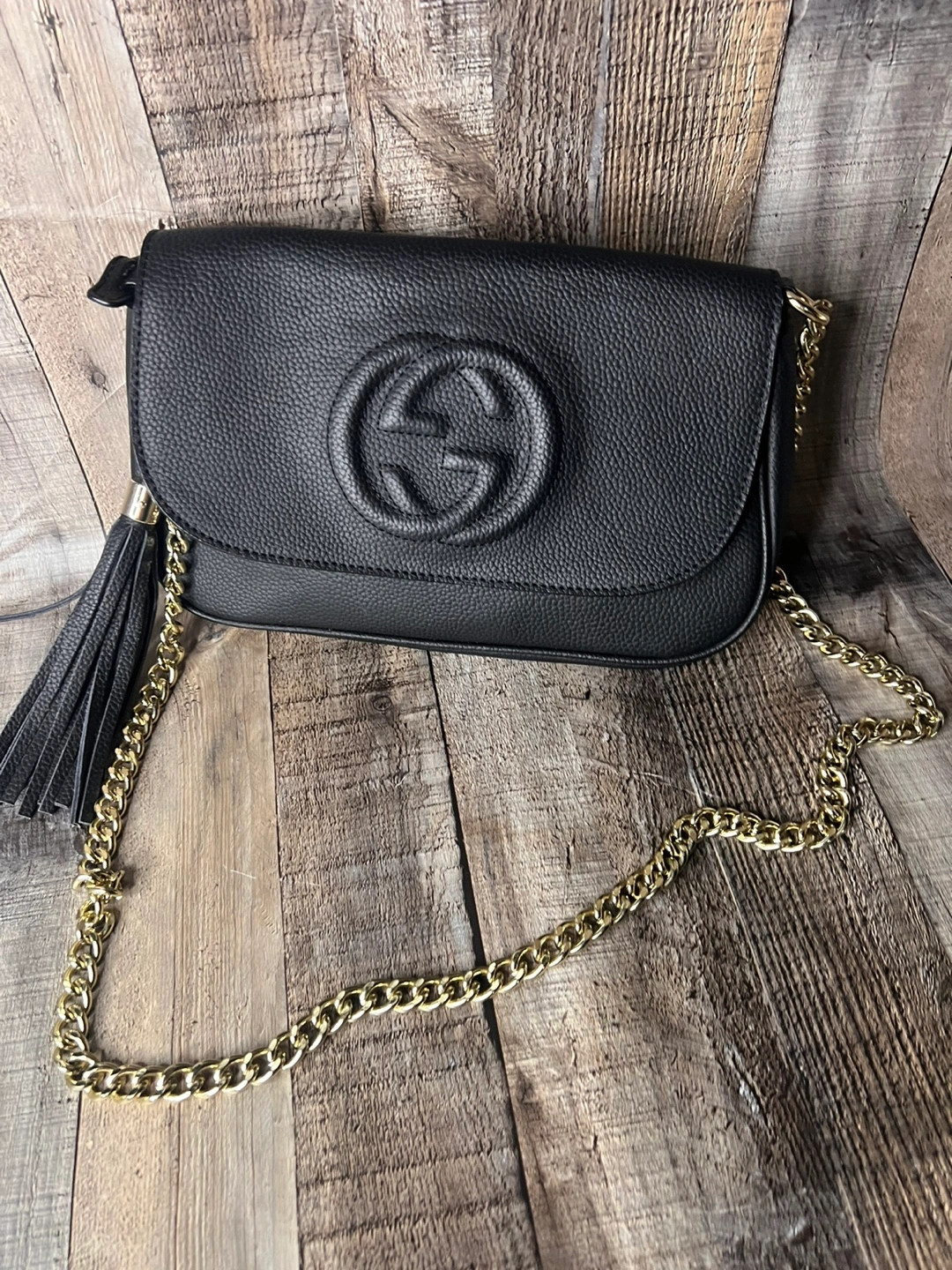 Selling a Gucci Soho Disco bag in black leather with a gold chain strap. It's in great condition and perfect for everyday use! Price reflects authenticity.