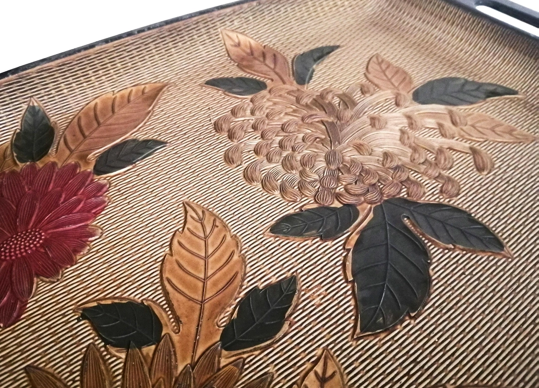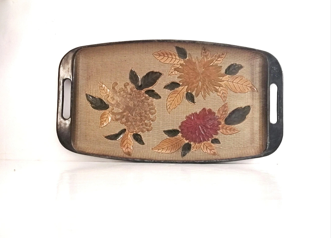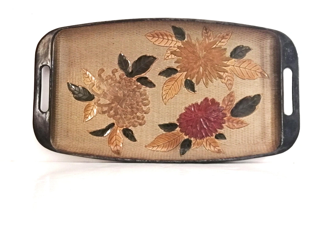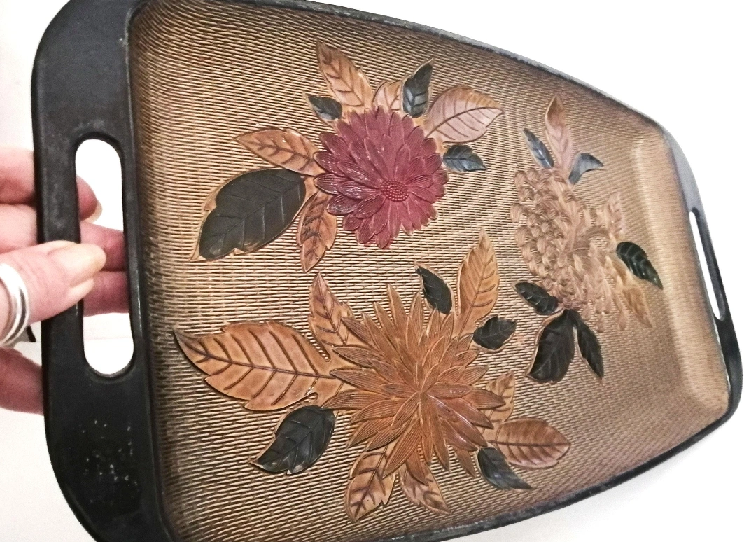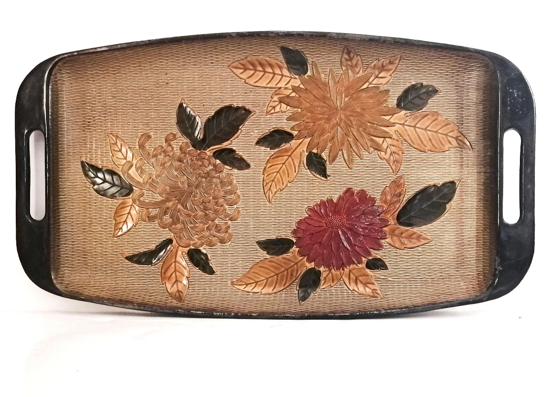Retro tray with raised relief floral pattern. Black and gold background. Measures 17.5 inches x 9.5 inches. Condition is age appropriate. Slightly rustic. Minor surface abrasions to rim. Excellent retro MCM vibe.