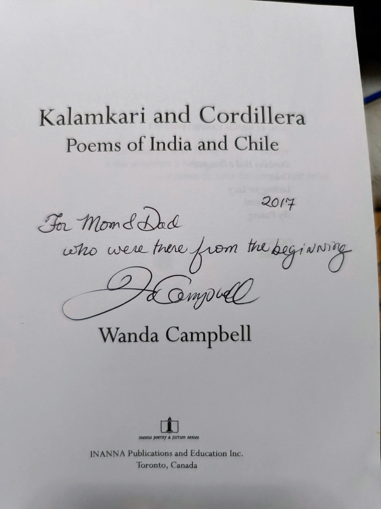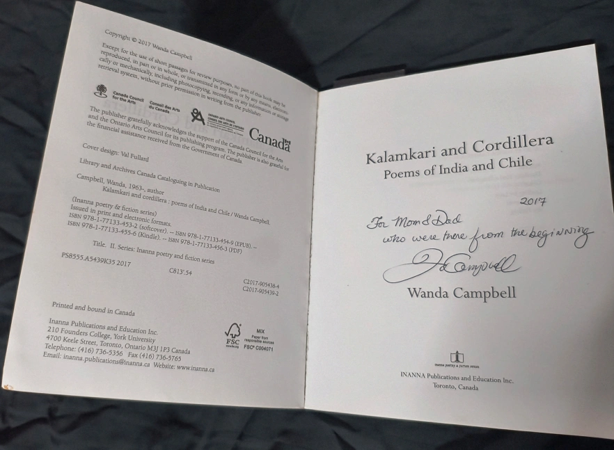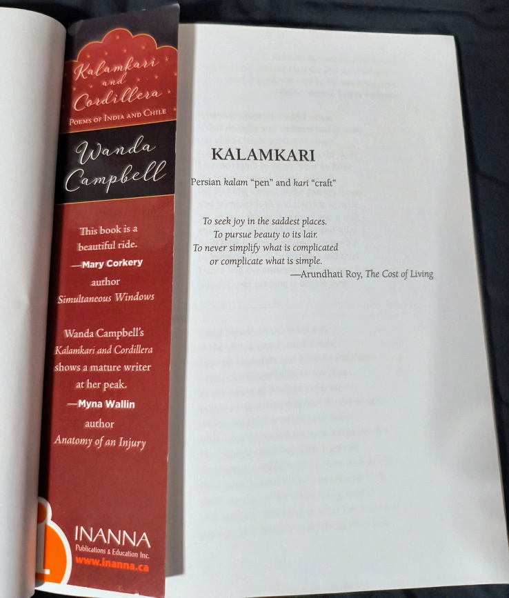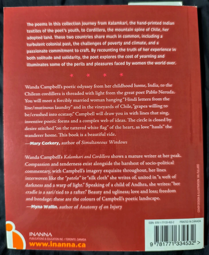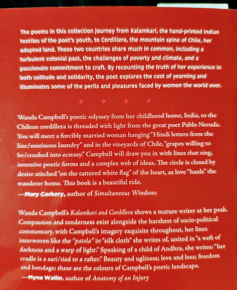 Selling a copy of "Kalamkari and Cordillera: Poems of India and Chile" by Wanda Campbell **Signed First Edition** It's a collection of poetry that explores themes of home, identity, and the experiences of women around the world. ** Pick Up In Kentville **