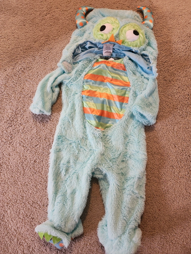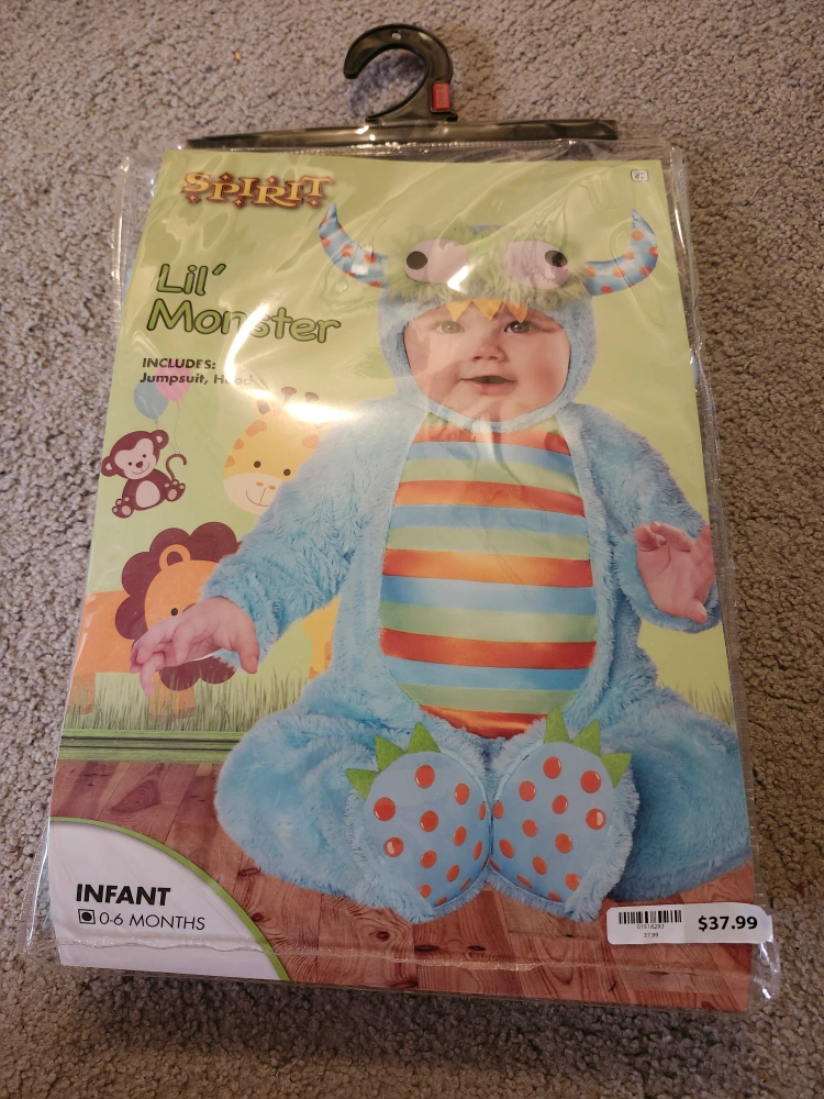 Selling a super cute Lil' Monster costume from Spirit Halloween! It's designed for infants aged 0-6 months and includes the jumpsuit and headpiece. Originally bought for $37.99. Perfect for Halloween or dress-up! selling for $15.00