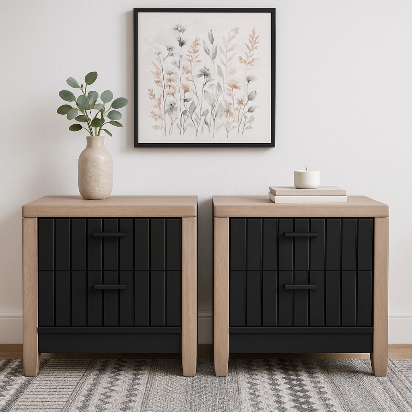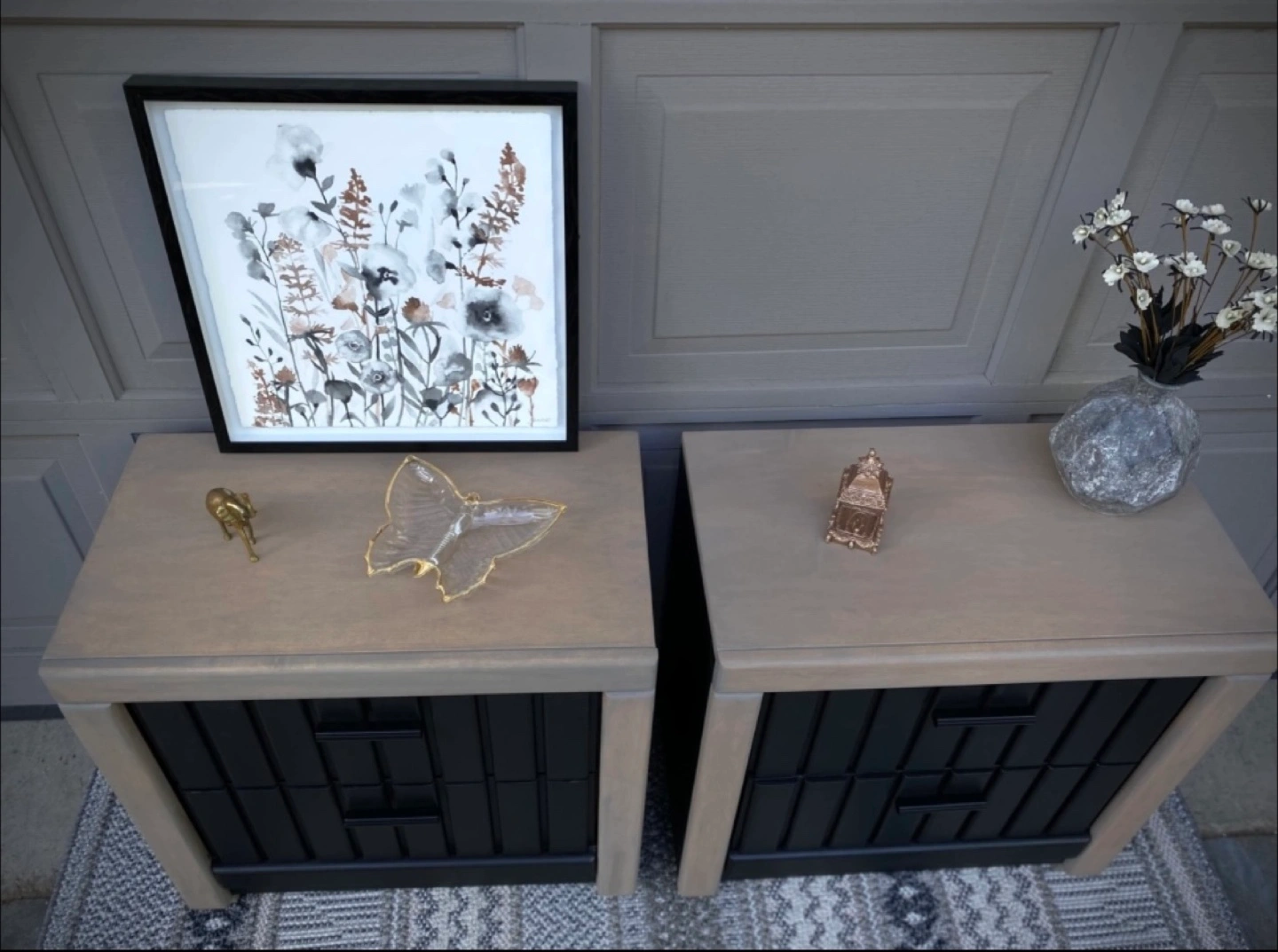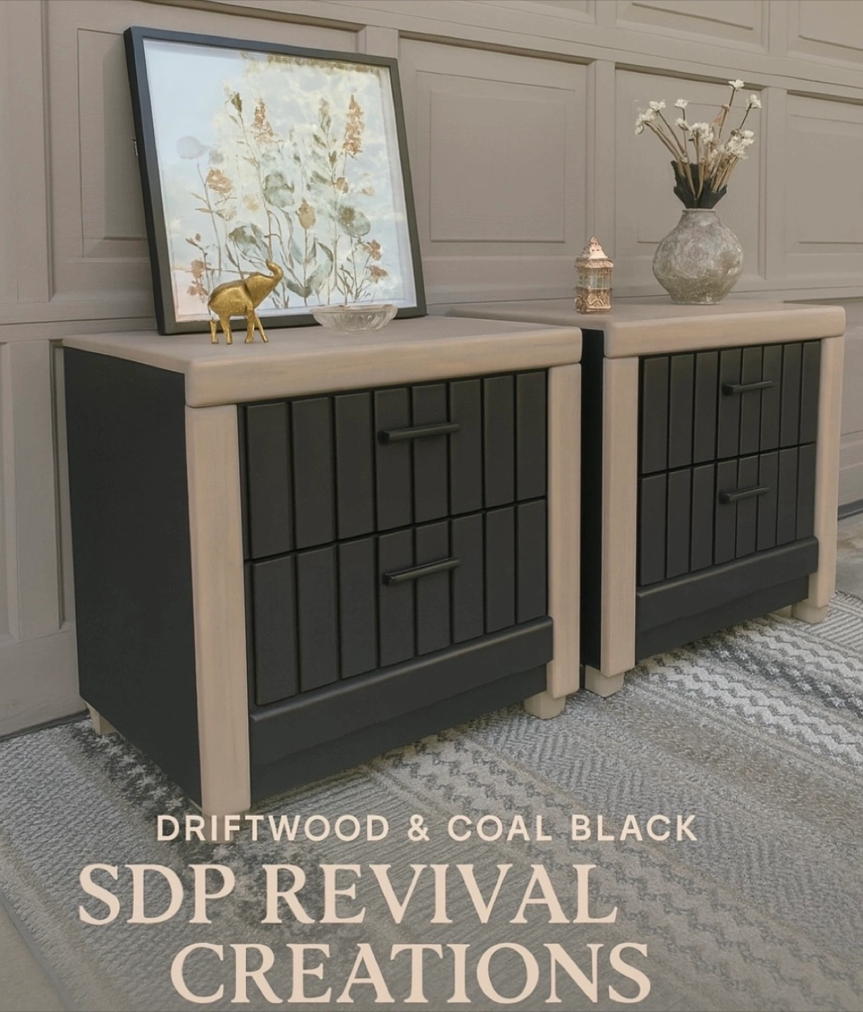 Bring timeless charm and modern contrast to your space with this striking pair of vintage Victoriaville end tables, professionally refinished by SDP Revival Creations. 🖤 Features: • Wood Tops & Side Accents: Sanded to raw wood and custom stained in a calming blend of Fusion SFO Taupe & Driftwood for a warm, natural finish • Body: Painted in Fusion Mineral Paint – Coal Black for a rich, moody contrast • Hardware: Upgraded with sleek matte black pulls • Base: Stands on custom 2” wooden feet for a subtle lift and modern edge 📏 Dimensions (each table): Width: 24.5” Depth: 14.5” Height: 24” Perfect as nightstands, end tables, or accent pieces in a modern, rustic, or boho-inspired space. 📦 Holds available with a 30% deposit