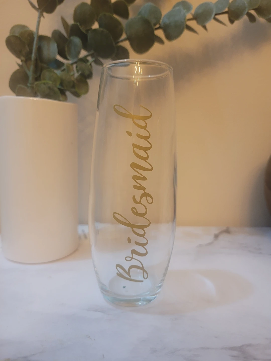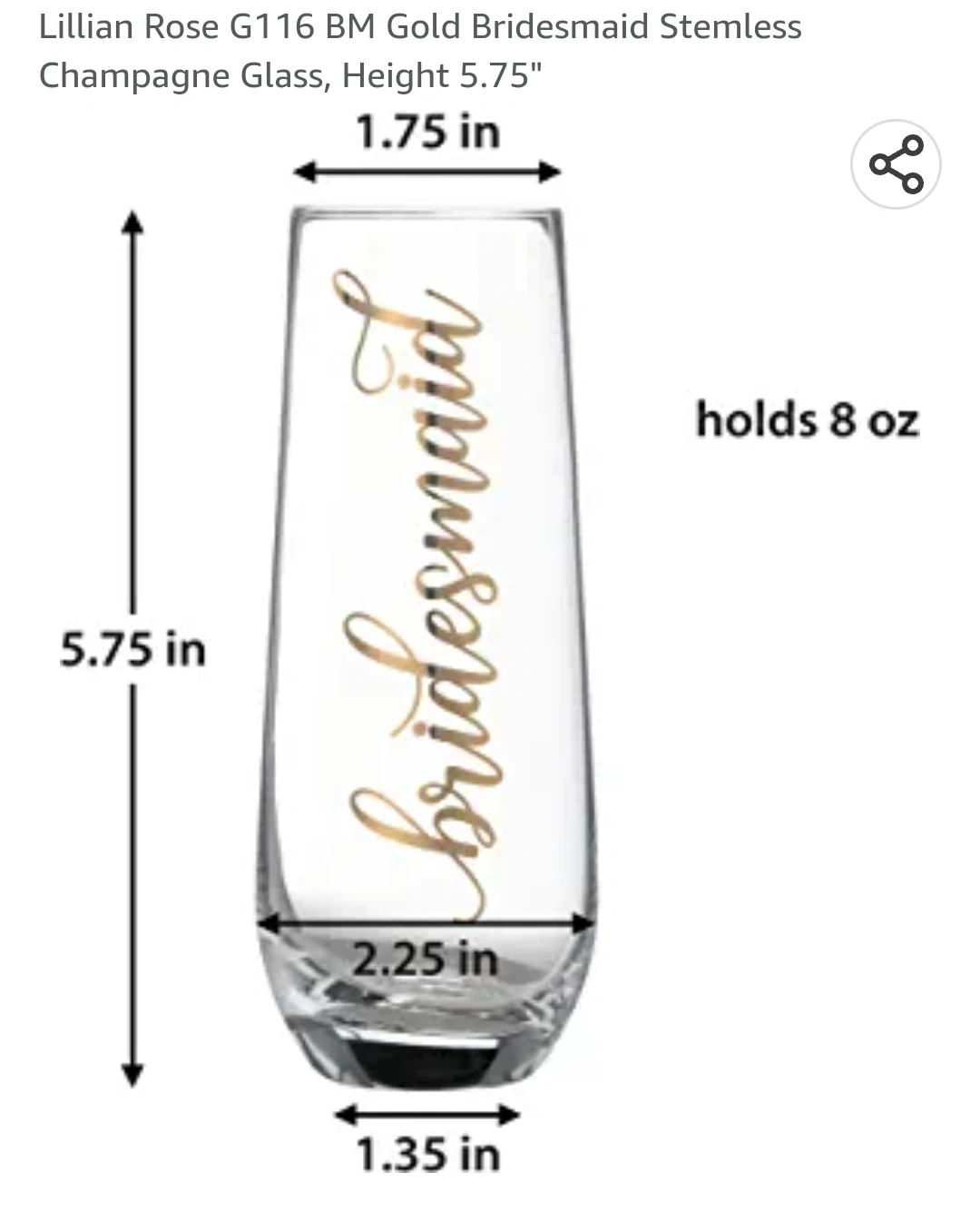New/unused champagne glass that says bridesmaid in gold lettering. Retails for $15+ online. specs in pictures :)