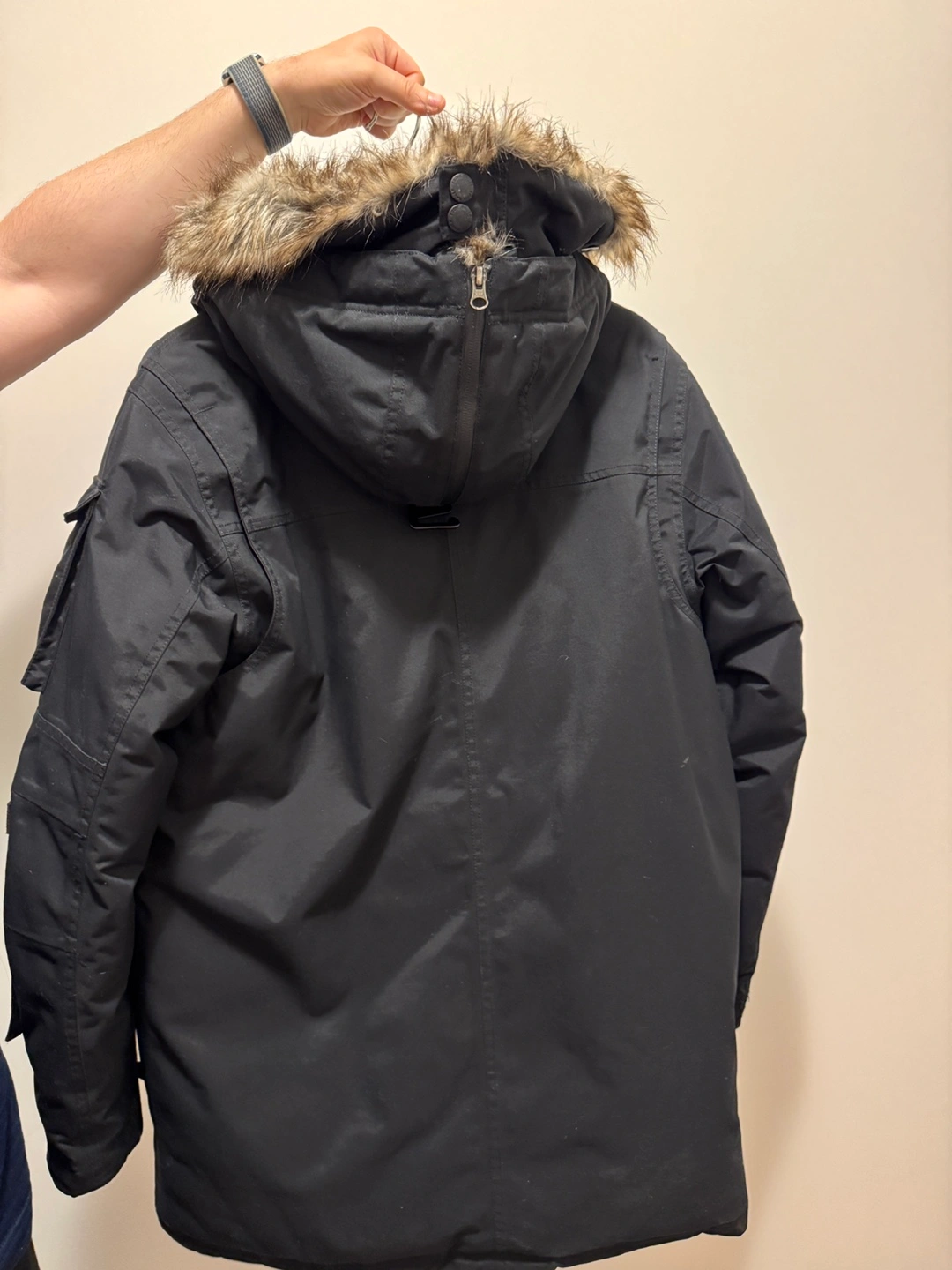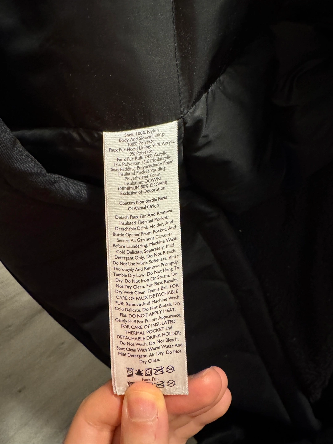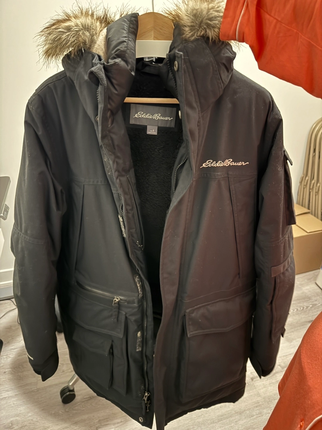 Selling an Eddie Bauer winter parka in black! It's got a faux fur hood and is super warm (holds great with up to -40) for those cold Canadian winters. - Shell: 100% Nylon - Body and Sleeve Lining: 100% Polyester - Faux Fur Hood Trim: 91% Acrylic, 9% Polyester - Faux Fur Rill Fabric Acrylic - Contains Non-textile Parts Of Animal Origin
